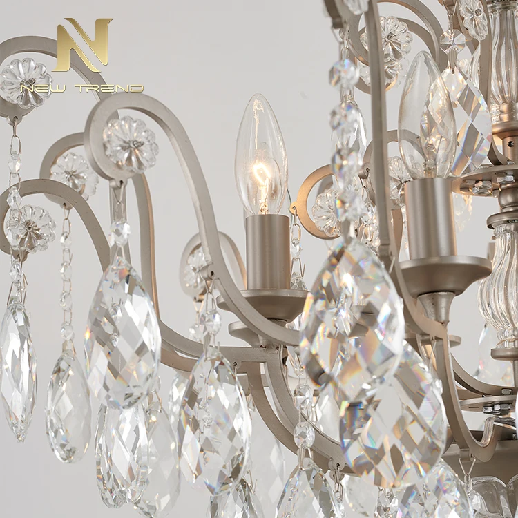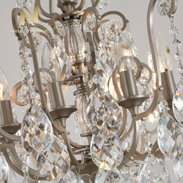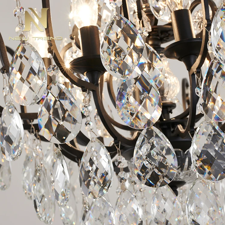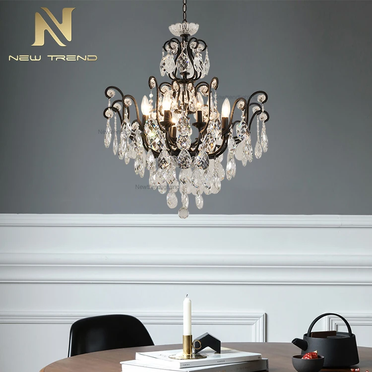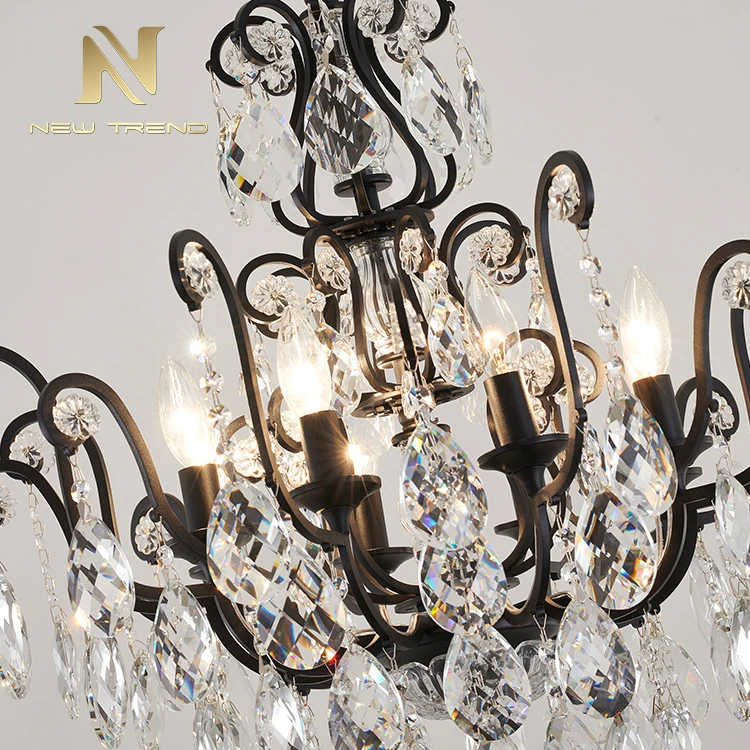 Good Quality European Style Crystal Pendant Lamp with Iron Frame and LED Chandelier LightThis elegant European-style crystal chandelier showcases timeless craftsmanship with its gracefully curved iron arms finished in a rich dark tone, each holding...