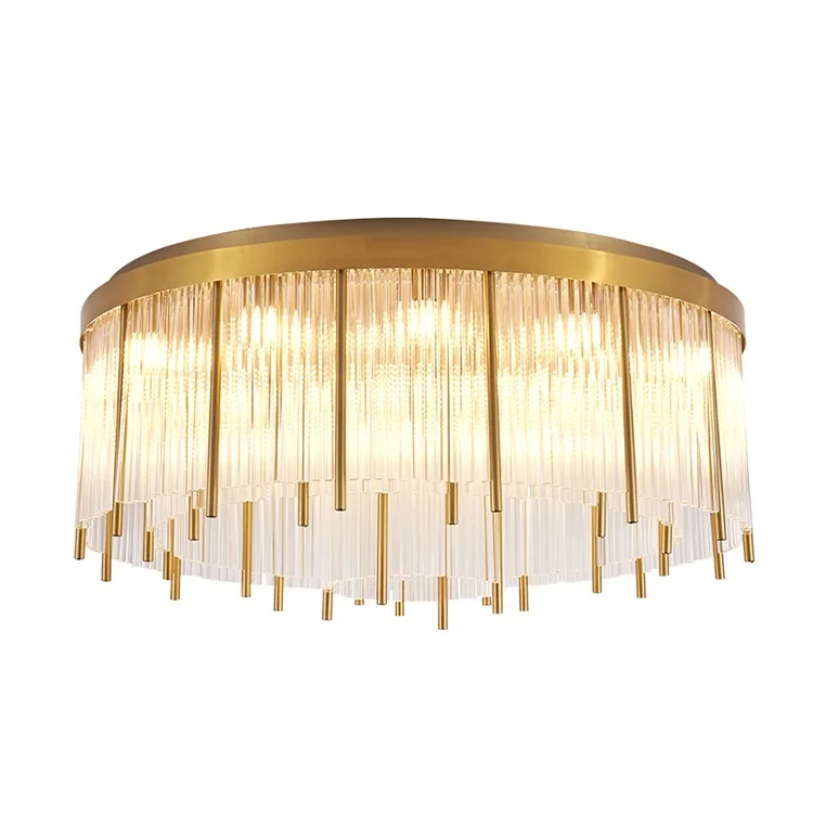 Crafted for discerning interiors, this exquisite ceiling light redefines modern elegance with its sculptural circular form. The design features meticulously arranged frosted glass tubes suspended in concentric rings within a sleek metallic frame, creating a captivating play of texture and depth. When illuminated, the energy-efficient LED sources emit a soft, diffused glow through the vertical glass elements, casting a warm and inviting ambiance perfect for living rooms, bedrooms, or upscale commercial spaces. The subtle gold-finish metal accents add a touch of luxury, harmonizing with both contemporary and transitional décors.