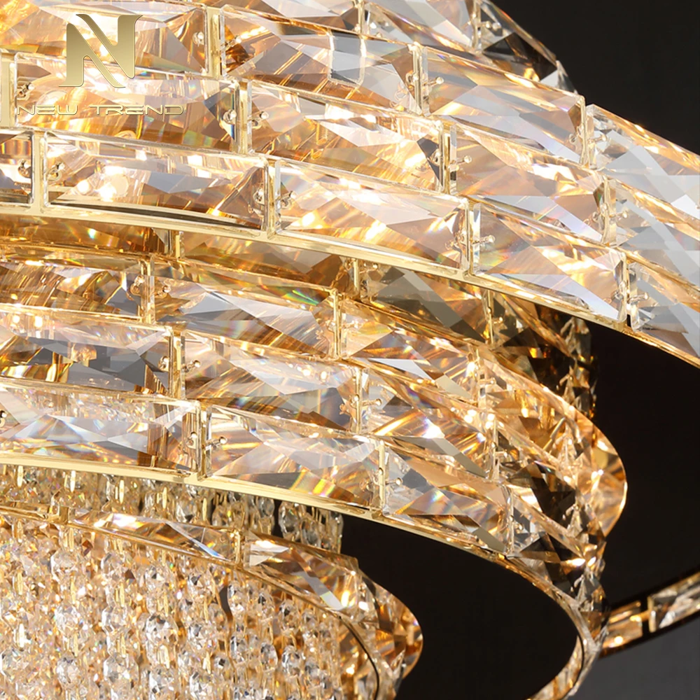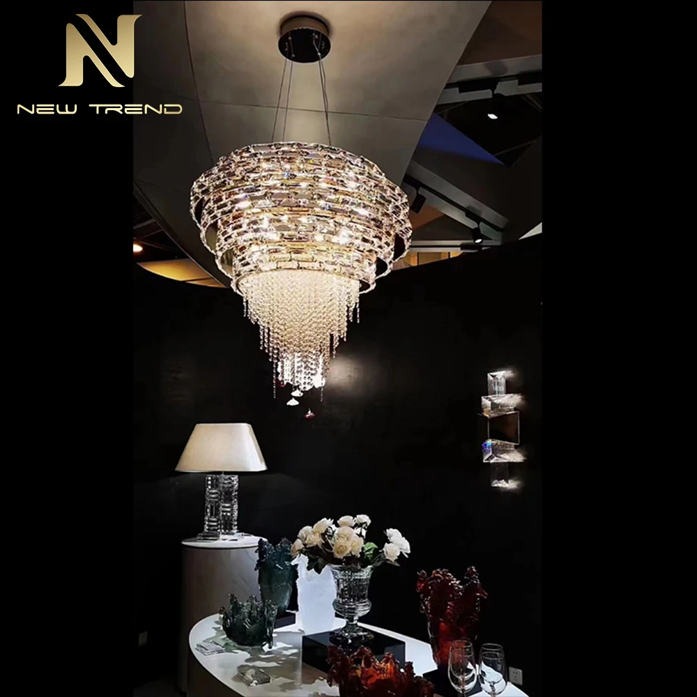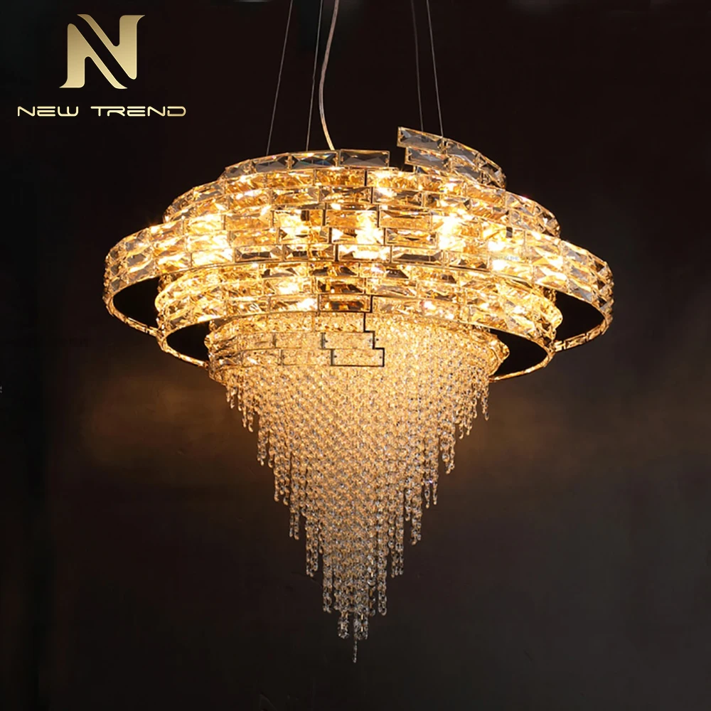 Newly Design Modern Luxury Round Crystal Chandelier Light – Customized Hotel Lobby & Home Decor Pendant LightThis stunning modern luxury chandelier showcases an exquisite multi-tiered circular design, featuring two elegantly nested golden metal rings embedded with meticulously arranged rectangular crystal elements. From the base cascades a breathtaking waterfall of delicate teardrop crystal beads, creating a dazzling play of light and dimension. The chandelier’s bold yet refined structure is enhanced by integrated energy-efficient LED lighting, which emits a warm, brilliant glow through the precision-cut crystals, casting radiant reflections and a luxurious ambiance. Ideal for grand hotel lobbies, upscale residences, or statement entryways, this custom pendant light combines contemporary artistry with timeless elegance, serving as a captivating centerpiece in any high-end interior.Crafted with premium materials, the chandelier’s golden framework and high-clarity crystals are displayed against a deep dark background, allowing its luminous presence to take full visual focus. Customizable in size, metal finish, and crystal density, this fixture adapts seamlessly to both classic and modern décors. Easy to install and designed for durability, it elevates residential and commercial spaces with unparalleled sophistication.Modern Round Crystal Chandelier, Luxury Hotel Lobby Lighting, Custom Crystal Pendant Light, Golden Metal Frame Chandelier, Waterfall Crystal Design, Home Decor Chandelier, Multi-Tiered LED Chandelier, Customizable Luxury Lighting, Crystal Teardrop Chandelier, Grand Entrance Pendant Light.