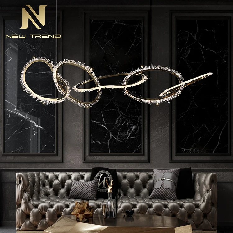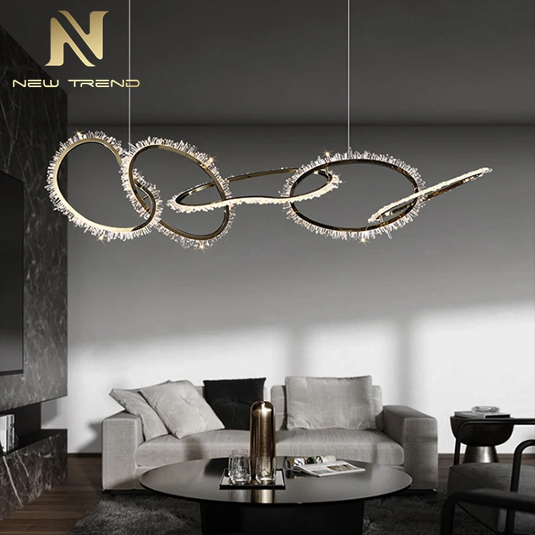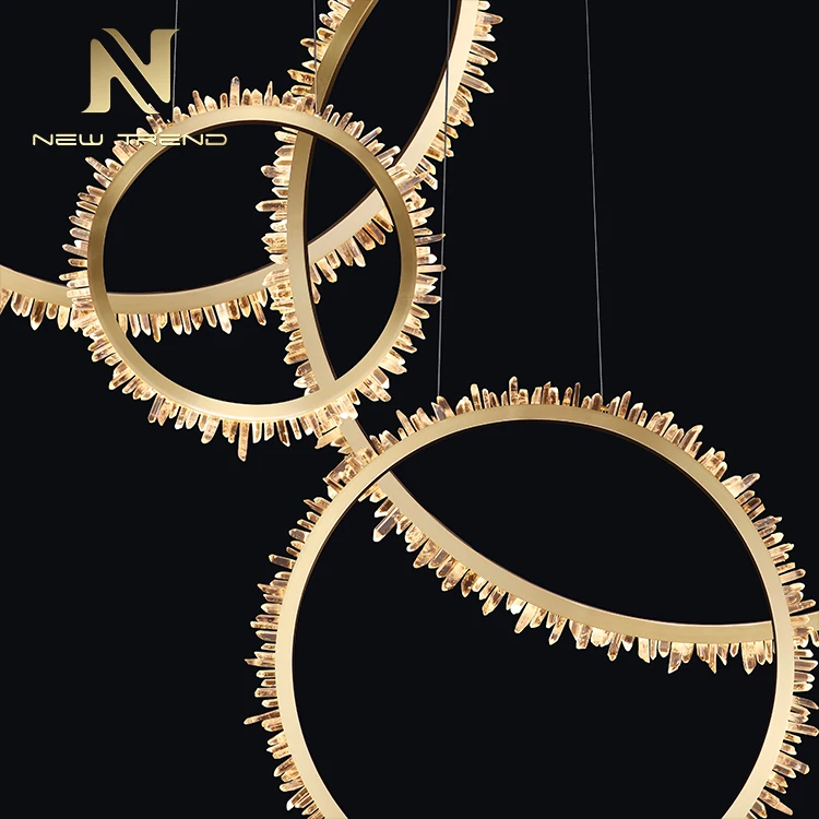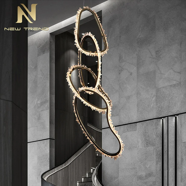 Creative Design Stainless Steel Natural Crystal Pendant Light for Hotel, Villa, Living Room, and StaircaseThis artistically crafted pendant light redefines luxury lighting with its dynamic composition of intertwined stainless steel rings in a warm golden hue, adorned with carefully hand-strung natural crystals. Each crystal captures and refracts light effortlessly, creating a dazzling play of brilliance and soft shadows. The fluid, spiral-shaped design evokes a sense of movement and elegance, making it an exceptional focal point for creative hotel lobbies, villa living rooms, or sweeping staircases. Crafted from high-quality stainless steel and genuine natural crystals, this pendant light combines durability with refined aesthetics, enhanced by integrated energy-efficient LED technology that offers warm, ambient illumination.Ideal for modern and high-end interiors, the fixture’s organic yet structured form complements both contemporary and opulent design themes. The neutral gray wall background and subtle architectural context emphasize its sculptural beauty, allowing it to stand out while harmonizing with its surroundings. Customizable in size, crystal density, and suspension length, this piece adapts gracefully to varied spatial requirements—whether as a single statement piece or in a curated cluster.Stainless Steel Crystal Pendant Light, Creative Hotel Villa Lighting, Living Room Staircase Chandelier, Natural Crystal Pendant Lamp, Luxury Spiral Design Chandelier, Modern Crystal LED Pendant, Custom Metal Ring Chandelier, Artistic Hanging Light, Stainless Steel and Crystal Light, High-End Decorative Lighting.