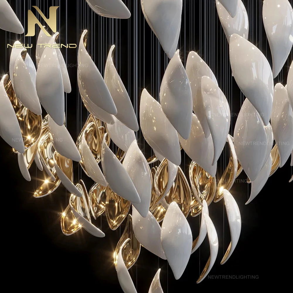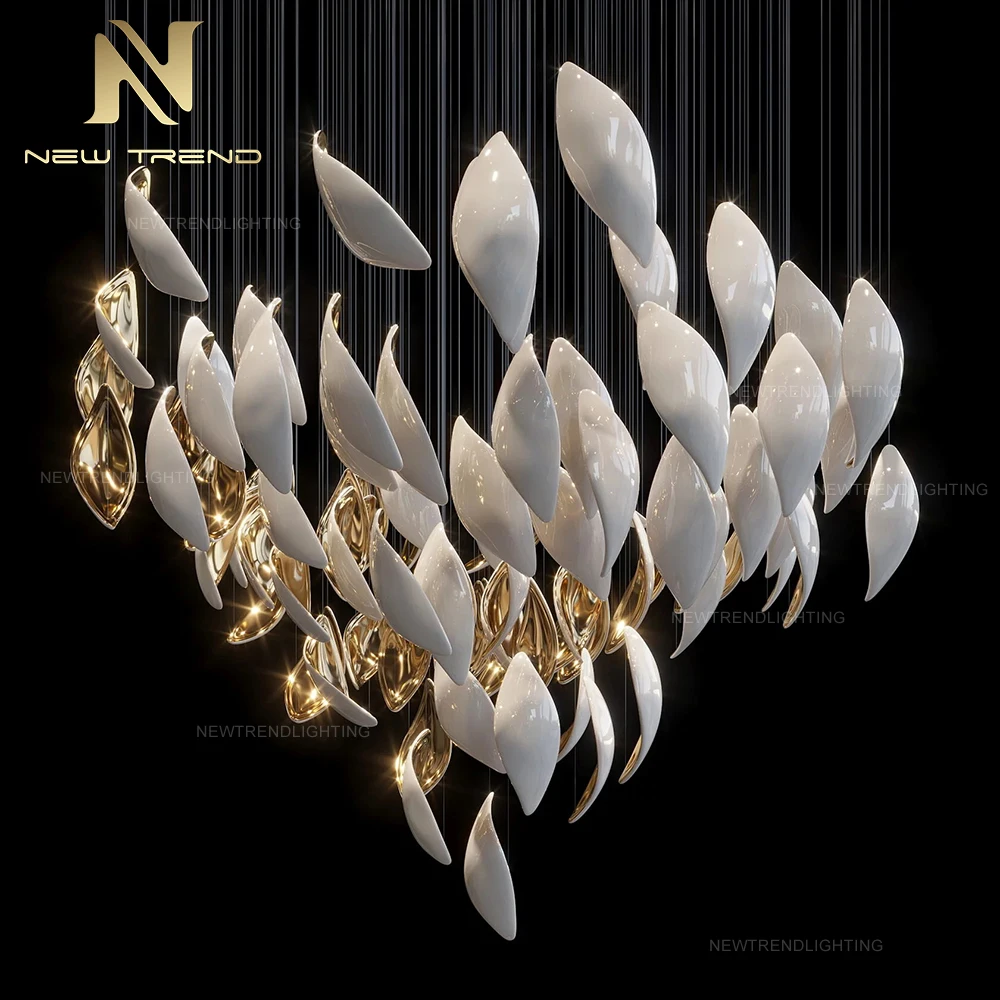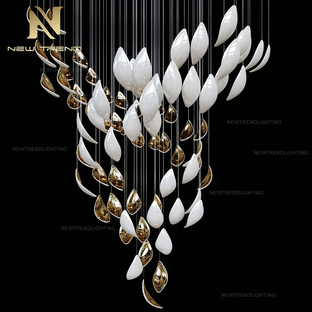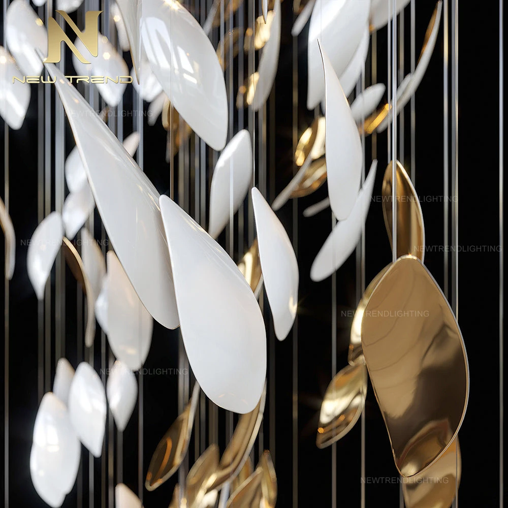 New Style Indoor Decoration Ceiling Hanging Lighting Villa Staircase Custom LED ChandelierThis innovative LED chandelier redefines modern elegance with its organic cluster of leaf-shaped shades suspended from delicate black cables, creating a sof...