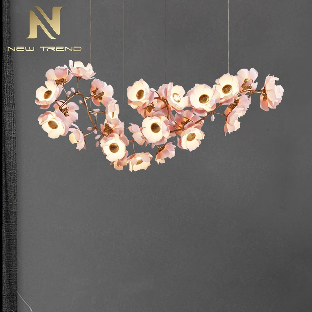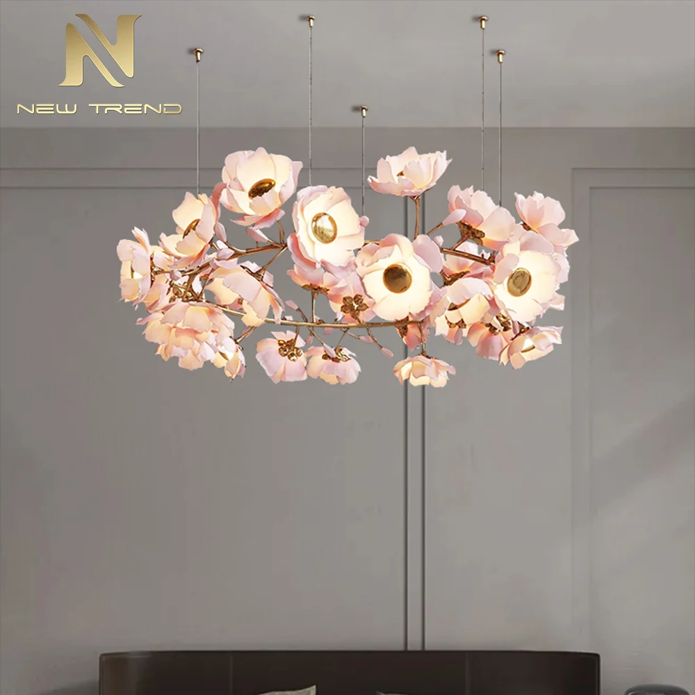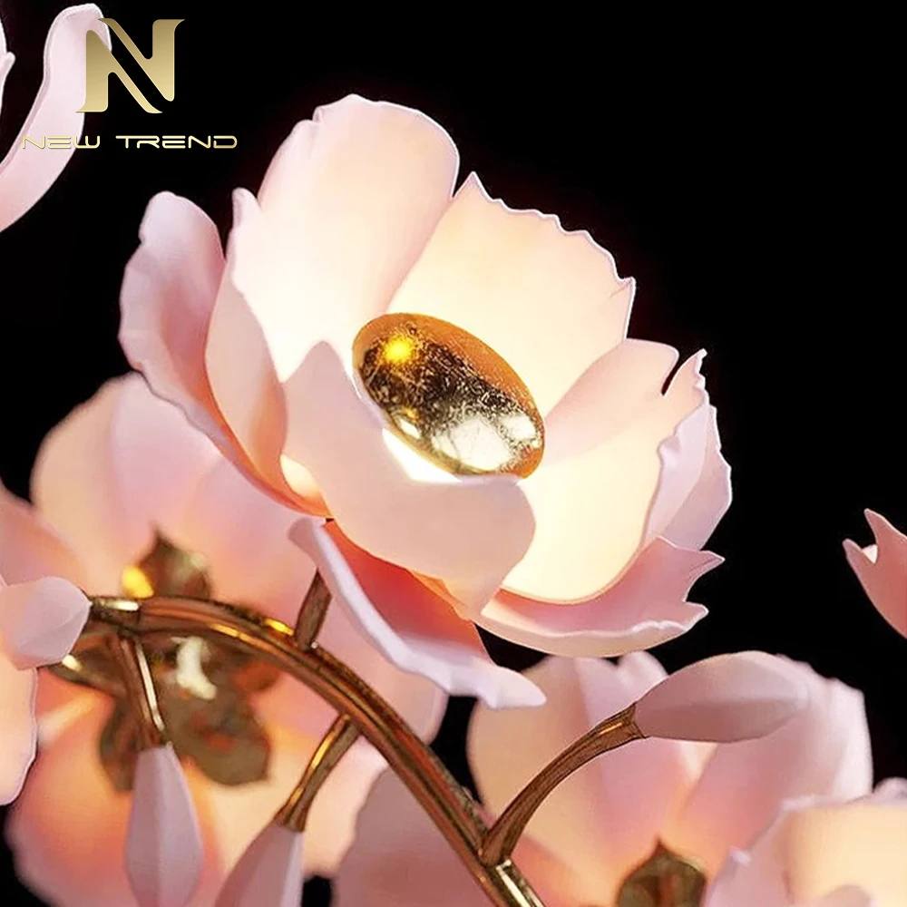 This exquisite natural-inspired chandelier features a breathtaking arrangement of handcrafted ceramic flowers in soft blush pink tones, each petal delicately shaped to capture the organic beauty of blooming blossoms. The flowers are meticulously assembled on slender metallic branches that extend gracefully in a cascading formation, with golden stamens at the center of each bloom adding a touch of luxury. When illuminated by integrated warm white LED lights, the semi-translucent ceramic petals glow with a soft, romantic radiance, creating a mesmerizing floral canopy effect. Ideal for enhancing villa staircases, apartment living rooms, or wedding venues, this chandelier brings the elegance of a spring garden indoors while providing functional ambient lighting.