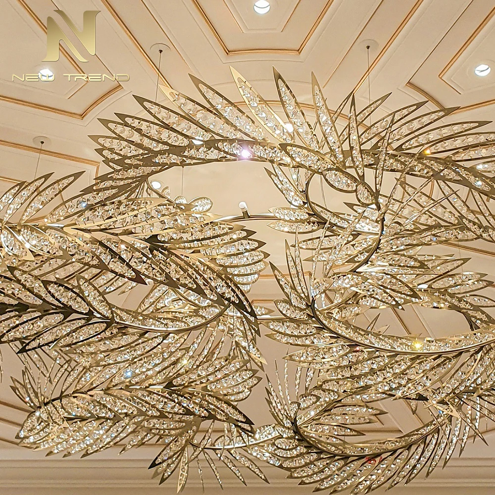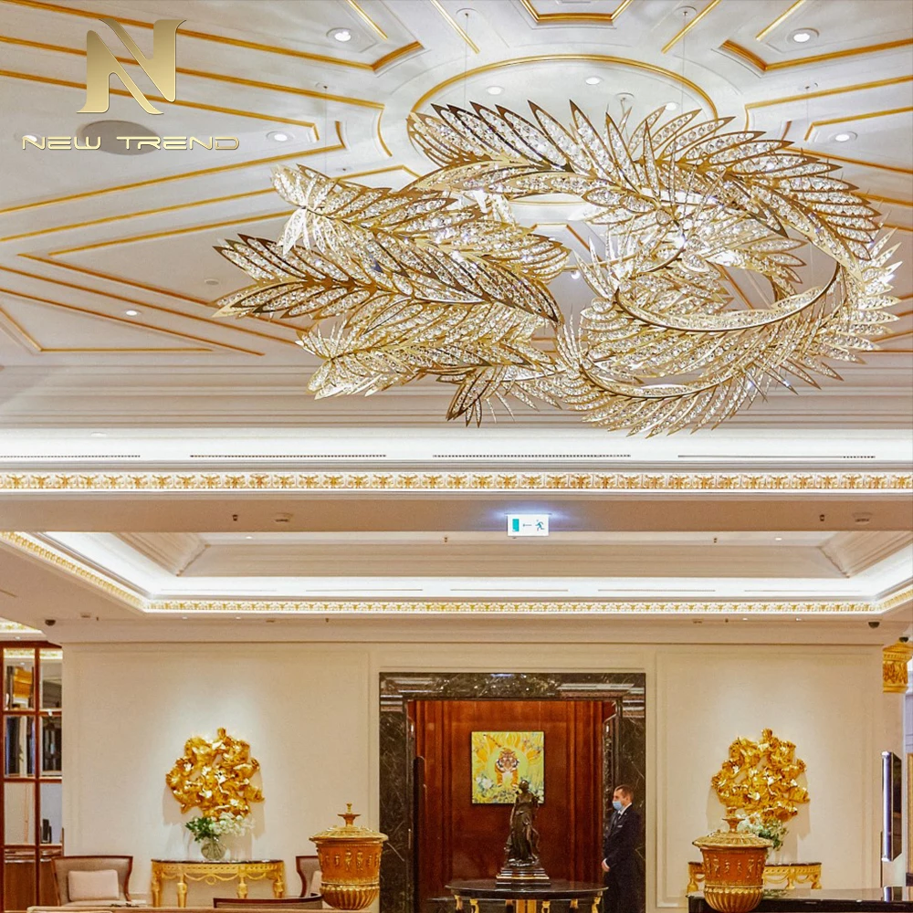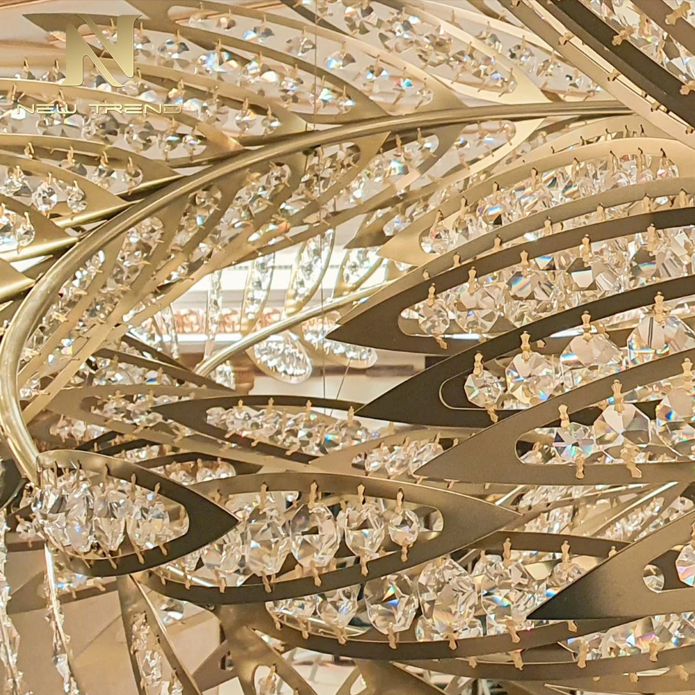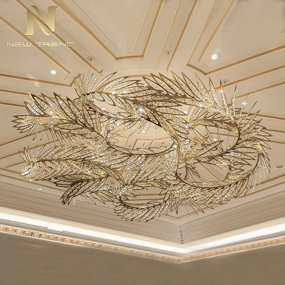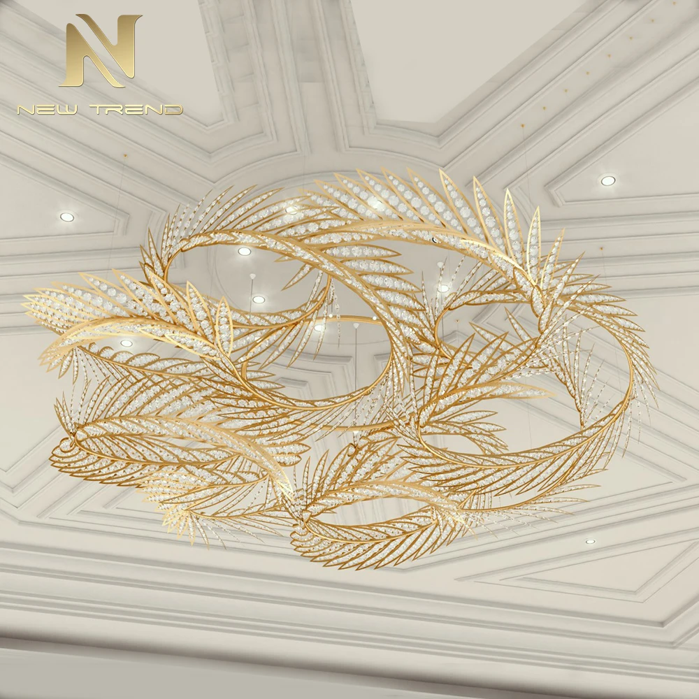 New Product Luxury Feather-Inspired LED Chandelier for Villa Hall, Hotel Lobby & Indoor Decoration Ceiling LightingThis exquisite new chandelier redefines luxury lighting with its breathtaking feather-inspired design, featuring meticulously crafted golden metal "feathers" adorned with sparkling crystal accents. Each feather-like element is artfully layered to create a dynamic, organic form that captures and refracts light beautifully. The integrated energy-efficient LED system emits a warm, radiant glow, enhancing the crystal’s brilliance and casting a dazzling play of light across the space. Ideal for elevating villa halls, hotel lobbies, or grand residential interiors, this ceiling light combines artistic craftsmanship with functional elegance, serving as a stunning centerpiece that embodies opulence and sophistication.Crafted with premium materials, the chandelier’s ornate design is complemented by a classic coffered ceiling backdrop, emphasizing its grandeur and timeless appeal. Customizable in size, finish, and crystal density, this fixture adapts seamlessly to various architectural styles, from traditional to contemporary. Easy to install and maintain, it offers a perfect blend of durability and visual impact for high-end commercial or residential projects.Luxury Feather LED Chandelier, Villa Hall Ceiling Light, Hotel Lobby Chandelier, Crystal Accent Chandelier, Gold Metal Feather Lighting, Custom Crystal Chandelier, Grand Interior Decoration, Elegant Ceiling Fixture, High-End LED Chandelier, Feather-Inspired Luxury Lighting.