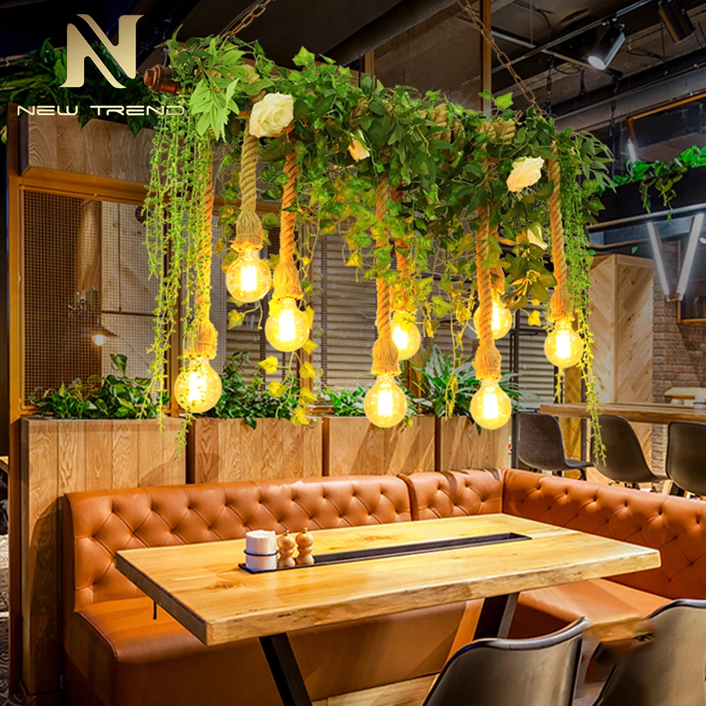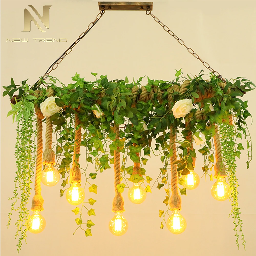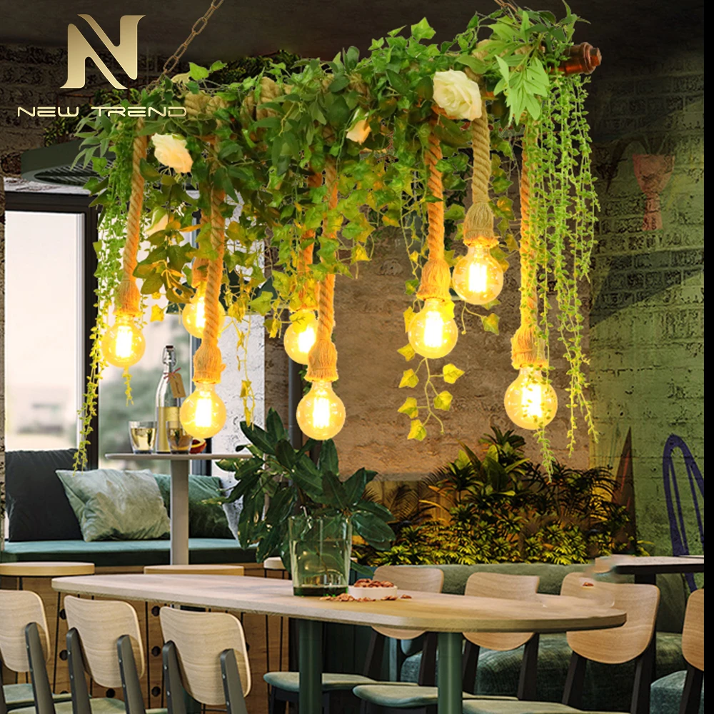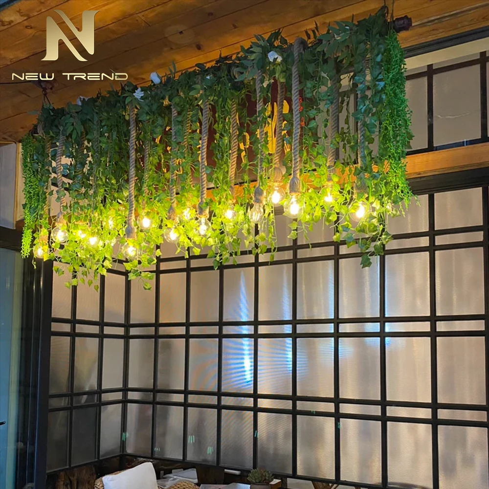 Green Nature Inspired Indoor Restaurant Wedding Decoration LED Chandelier Pendant LightThis enchanting nature-inspired LED pendant light brings the beauty of the outdoors into interior spaces, featuring a lush arrangement of fresh green foliage, vibrant orange-yellow roses, carnations, and cascading ivy meticulously woven across a suspended horizontal frame. The fixture is elegantly suspended by dark metal chains, with natural jute ropes hanging vertically from the base, each ending with a warm, glowing vintage-style LED bulb. Ideal for restaurants, wedding venues, or rustic-chic indoor spaces, this chandelier creates a romantic, organic atmosphere, blending floral charm with soft, ambient lighting.Crafted to evoke a garden-fresh aesthetic, the chandelier combines real or high-quality artificial botanicals with energy-efficient LED technology. The clean white background and subtle wooden shelving in the setting enhance its natural appeal, allowing the vibrant flowers and greenery to stand out. Easy to install and customizable in length or floral density, this piece adds a touch of whimsical elegance to any special occasion or everyday dining experience.Nature Inspired LED Pendant Light, Restaurant Wedding Decoration Chandelier, Green Floral Chandelier, Rustic Wedding Lighting, Vintage Bulb Pendant Light, Botanical Indoor Chandelier, Eco-Friendly Event Lighting, Hanging Garden Chandelier, Romantic Wedding Decor, Natural Theme LED Light.