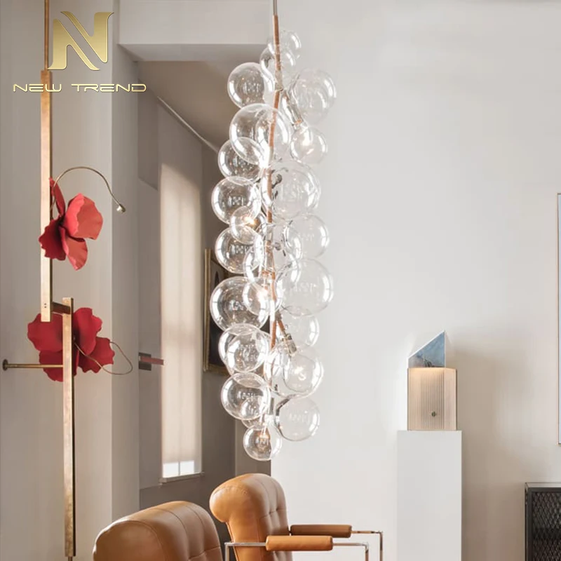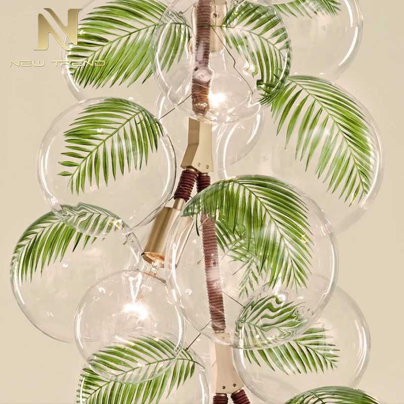 This contemporary LED chandelier redefines artistic lighting with its organic yet minimalist design. A slender brown stem serves as the central axis, from which numerous frosted glass balls of varying sizes are suspended at different heights. Select larger globes incorporate energy-efficient white LED bulbs, emitting a soft, ambient glow through the translucent surface. The standout feature is the delicate deep-blue leaf patterns hand-finished on the glass—each feather-like motif enhancing the fixture’s natural elegance. Ideal for modern living rooms, dining areas, staircases, or boutique hotels, this piece harmonizes industrial simplicity with botanical charm, creating a striking visual rhythm and a soothing atmosphere.