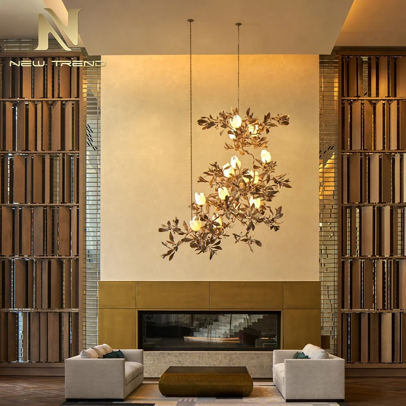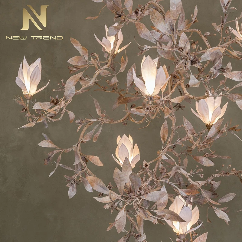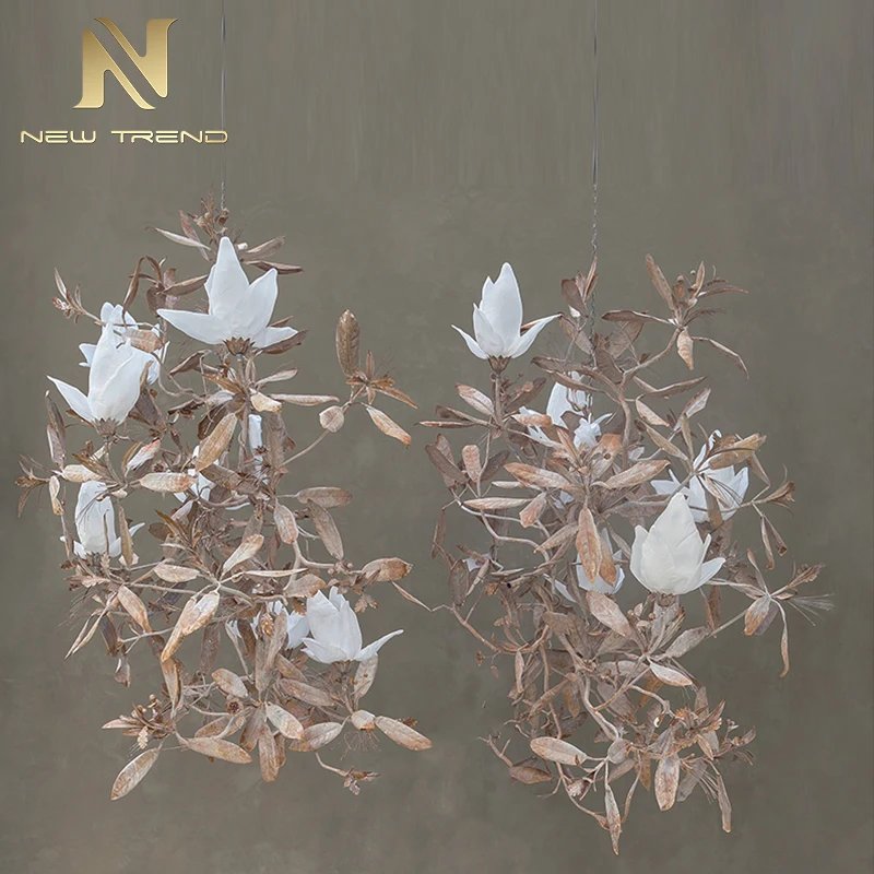 Nature Style Residential Decoration Indoor Hotel Lobby Staircase Villa Living Room Magnolia Modern LED Chandelier Pendant LightThis exquisite magnolia-inspired LED chandelier captures the delicate beauty of blooming flowers with astonishing realism. Crafted with lifelike white magnolia blossoms and natural-textured leaves, each petal is made of high-quality polymer or ceramic to replicate the soft, organic appearance of real flowers. The branches are artfully arranged in a graceful, asymmetrical formation, creating a natural yet elegant silhouette. Integrated energy-efficient LED lighting is discreetly placed within the floral clusters, emitting a soft, warm glow that highlights the delicate veining of each petal and creates a serene, welcoming ambiance.Ideal for enhancing residential living rooms, villa staircases, or hotel lobby spaces, this chandelier brings a touch of nature indoors while maintaining a sophisticated aesthetic. The dark background emphasizes the purity of the white blossoms and the rich green leaves, making it a stunning focal point in both modern and traditional interiors. The fixture is customizable in size, branch layout, and lighting intensity, allowing it to adapt to various ceiling heights and spatial designs.Magnolia LED Chandelier, Nature Style Pendant Light, Residential Decoration Lighting, Hotel Lobby Floral Chandelier, Villa Staircase Lighting, Realistic Flower Chandelier, Modern Nature-Inspired Light, Indoor Botanical Chandelier, Customizable Floral Lighting, Elegant Magnolia Ceiling Light.