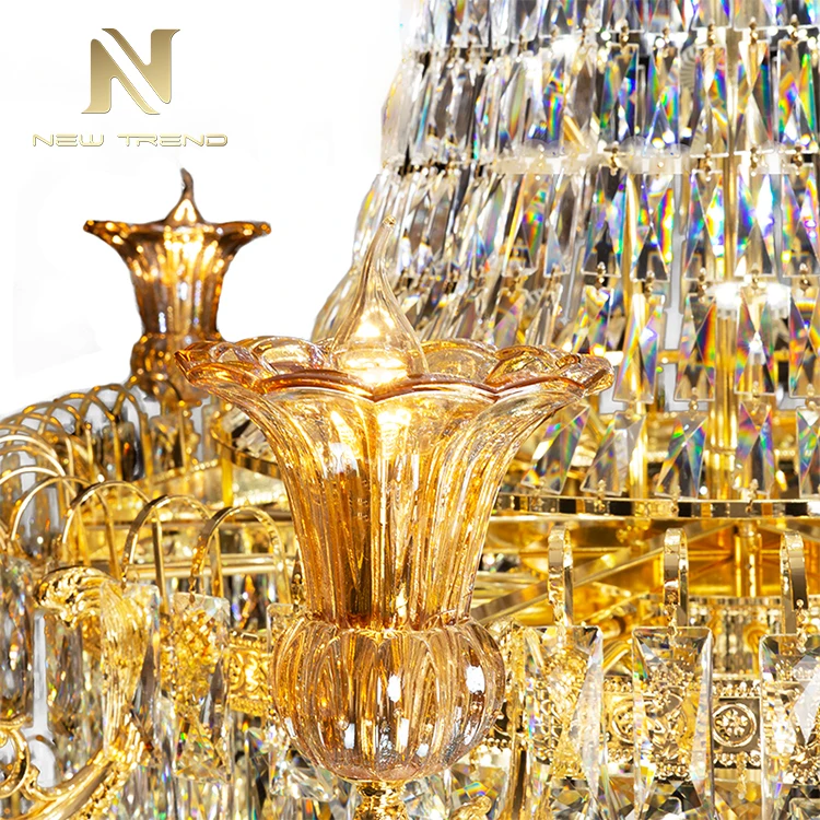 This stunning new arrival features a grand multi-tiered crystal chandelier meticulously designed for luxury restaurant and hotel lobby environments. Crafted with countless precision-cut transparent crystals and an elegant golden metal framework, the chandelier forms a饱满, cascading bell-shaped silhouette that radiates opulence. Integrated with energy-efficient LED technology, the upward-facing candle-style lights emit a warm, inviting glow, enhancing the crystal’s natural brilliance and creating a dazzling play of refracted light. Ideal for elevating commercial and hospitality interiors, this piece combines timeless craftsmanship with modern functionality, making it a captivating centerpiece in any high-end space.