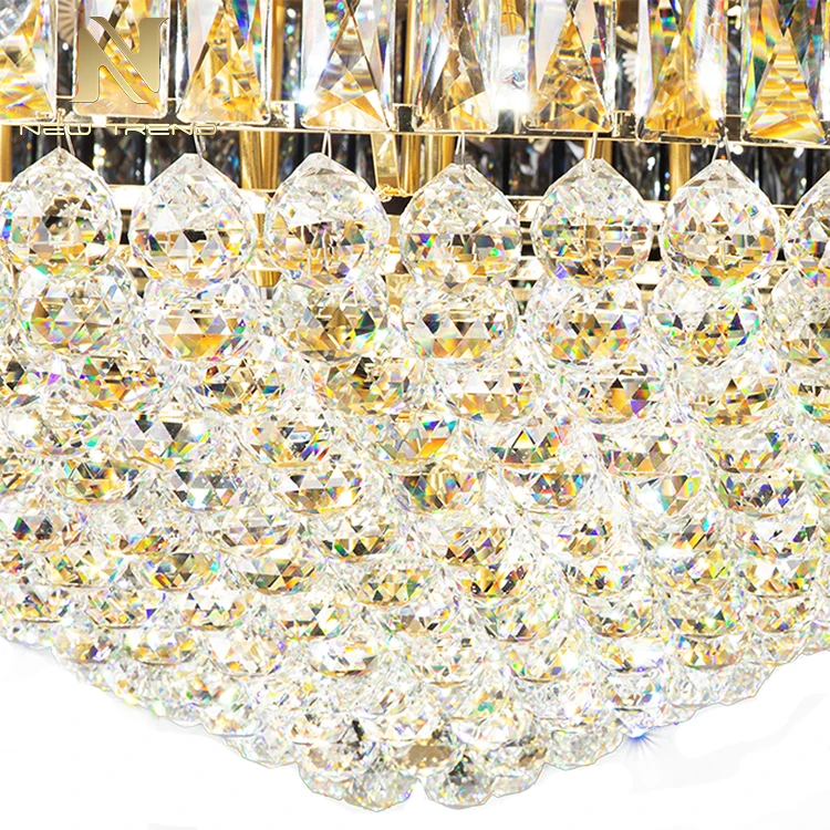 Designed to make a bold visual statement, the chandelier’s layered structure ensures even, ambient illumination while adding depth and sophistication to large areas. Each crystal is strategically arranged to maximize light reflection, producing a luxurious sparkle that complements both classic and contemporary decor themes. Customization options include size adjustments, metal finish variations, and crystal density, allowing seamless adaptation to diverse project requirements. Built with durability and elegance in mind, this chandelier is perfect for hotels, fine dining restaurants, corporate atriums, or grand residential entries.