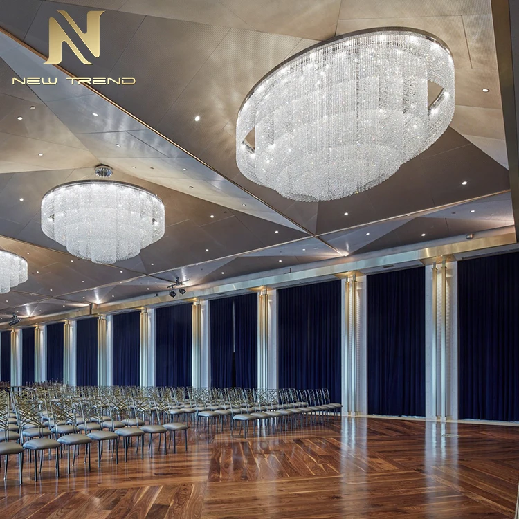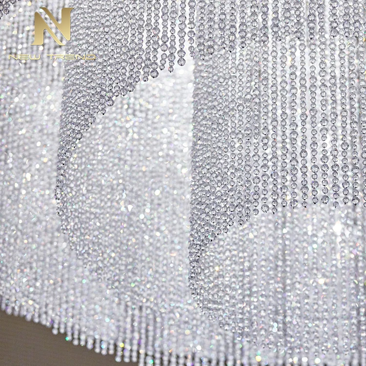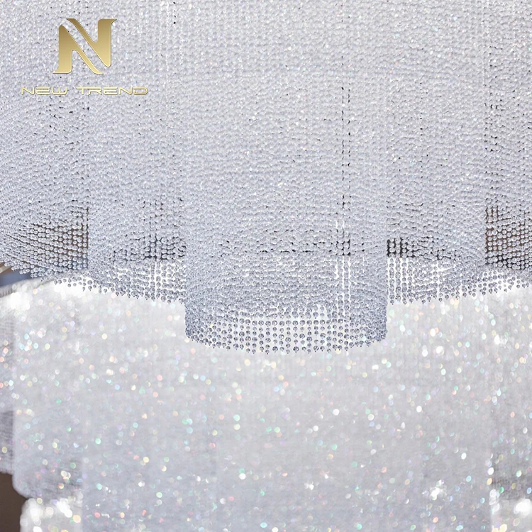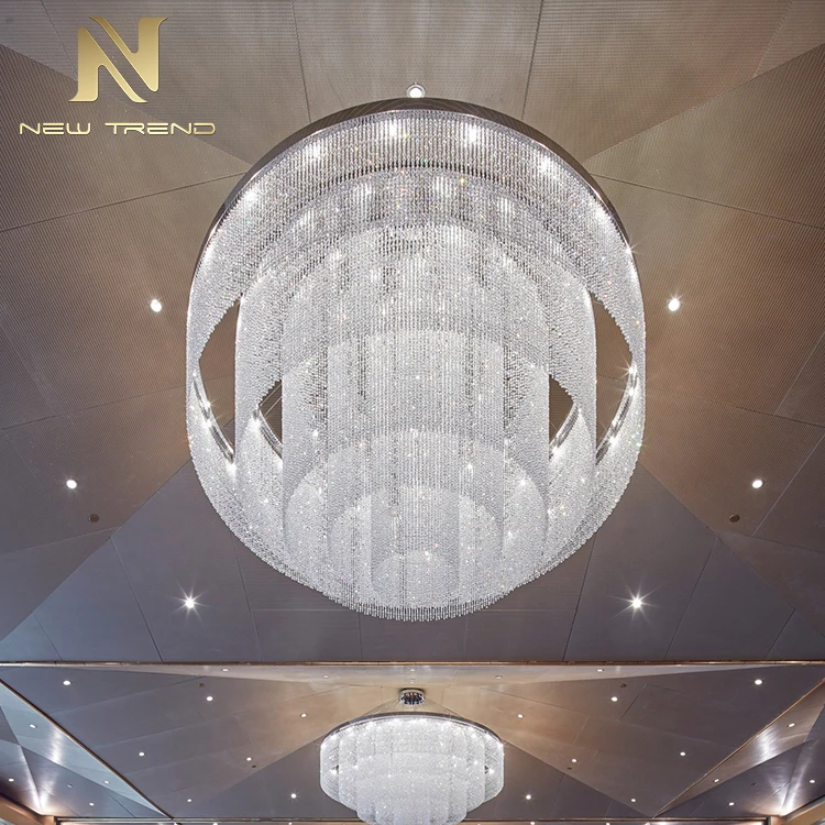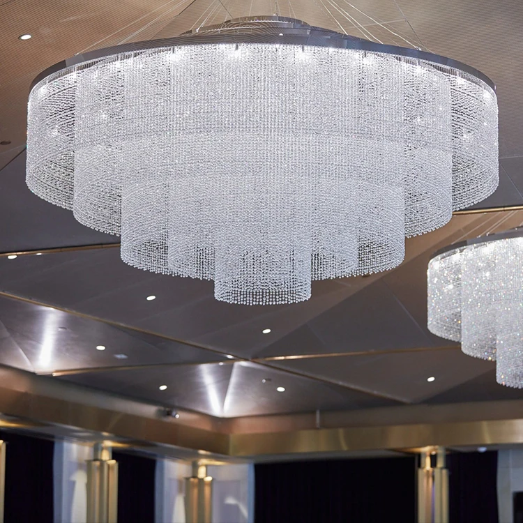 New Product Hall Hotel Lobby Luxury Decoration Lighting Large Custom Made Crystal ChandelierThis magnificent large custom-made crystal chandelier is designed to transform grand commercial and hospitality spaces with its breathtaking multi-tiered, waterfall-inspired structure. Featuring meticulously arranged concentric layers of transparent crystal beads and precision-cut prism elements, the fixture creates a cascading curtain of light that refracts illumination into a dazzling display of brilliance. When illuminated by integrated energy-efficient LED lighting, the chandelier emits a soft yet radiant glow, casting elegant light patterns across ceilings and walls—perfect for enhancing hotel lobbies, atrium entrances, luxury shopping malls, or high-end event venues.Crafted with premium K9 crystals and a durable metal frame finished in polished gold, silver, or bronze, this chandelier combines timeless elegance with modern functionality. Its scalable design allows for bespoke adjustments in diameter, tier density, and suspension length to suit varied ceiling heights and spatial layouts. The dark, metallic-toned ceiling background emphasizes the fixture’s luminous presence, making it a captivating centerpiece that embodies opulence and architectural sophistication.Large Custom Crystal Chandelier, Hotel Lobby Decoration Lighting, Luxury Hall Chandelier, Waterfall-Style Crystal Light, Multi-Tiered LED Chandelier, Commercial Space Chandelier, Custom Made Crystal Fixture, Grand Lobby Lighting, Premium K9 Crystal Chandelier, Architectural Decorative Chandelier.