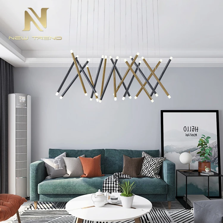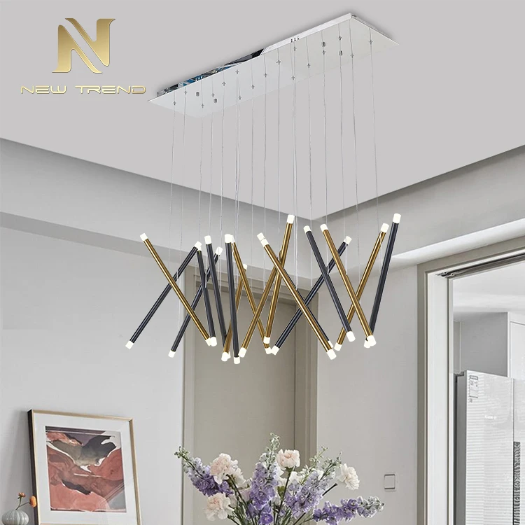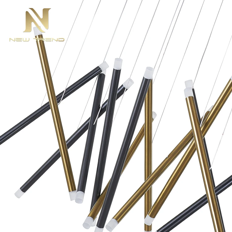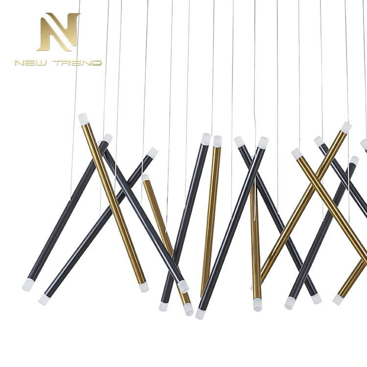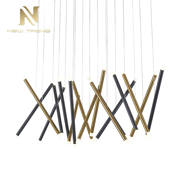 High Quality Modern Hotel Lobby Dining Room Decoration Aluminum Brass LED Pendant LampThis stunning modern pendant lamp features an artistic cluster of cylindrical aluminum tubes in a sophisticated combination of matte black and polished brass fin...