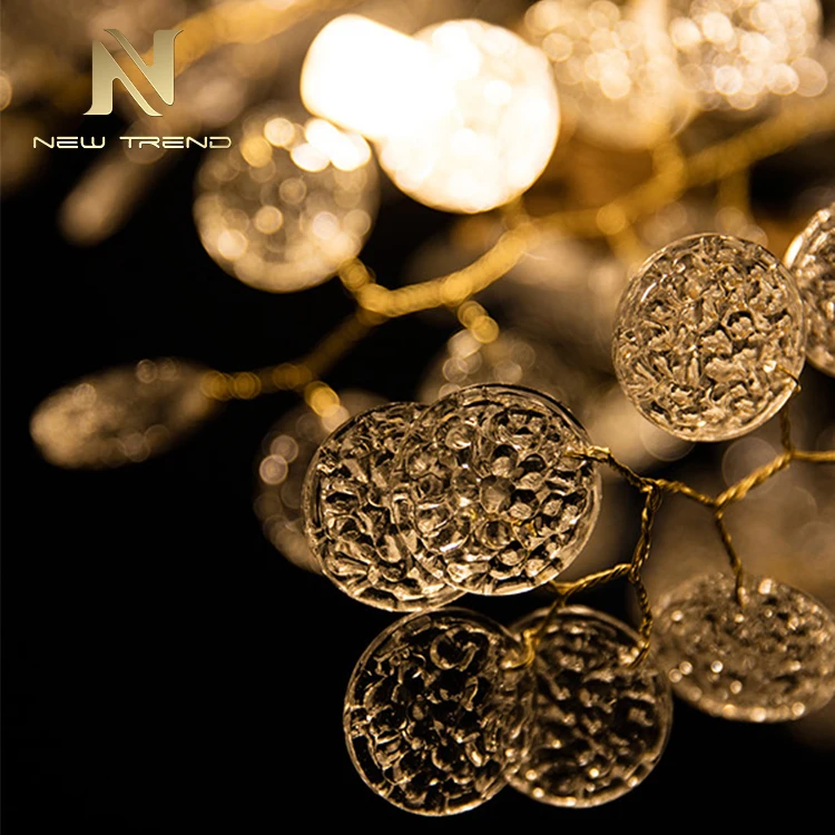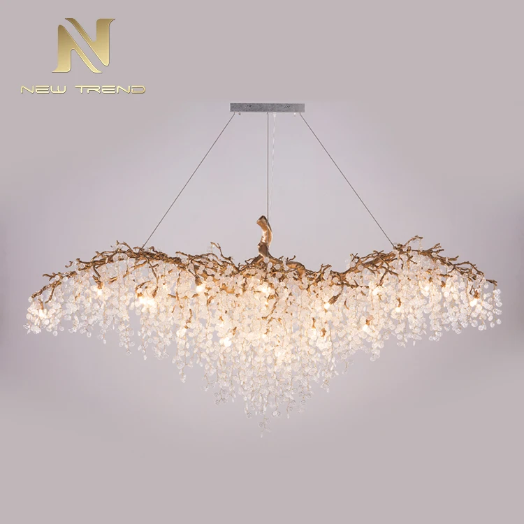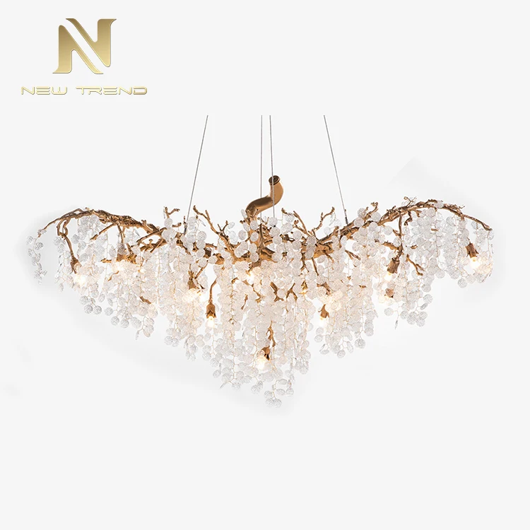 Material: Copper glaze metal frame with hand-strung crystal beads Lighting: Energy-efficient LED system with warm golden illumination Design: Organic branch-like structure with cascading crystal arrangements Application: Perfect for large indoor spaces like halls, ballrooms, and hotels Customization: Available in size, crystal density, and finish variations