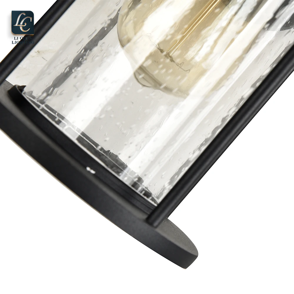 깔끔하고 모던한 외관을 위한 블랙 메탈 프레임과 투명 유리 원통 실외 사용에 적합한 방수 등급 에너지 절약형 LED 전구와 호환되는 E26 소켓 미국 안전 기준을 충족하는 ETL 인증 제품 대부분의 외부 표면에 간편하게 설치 가능