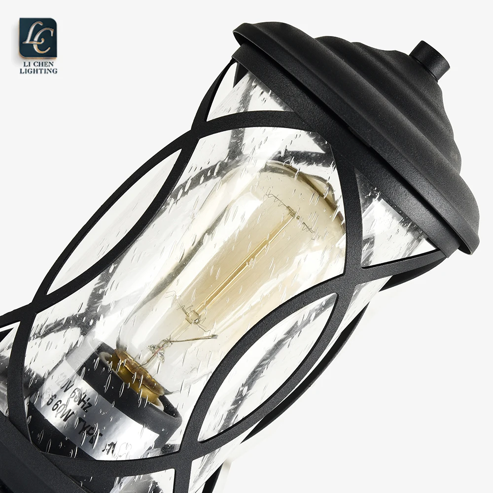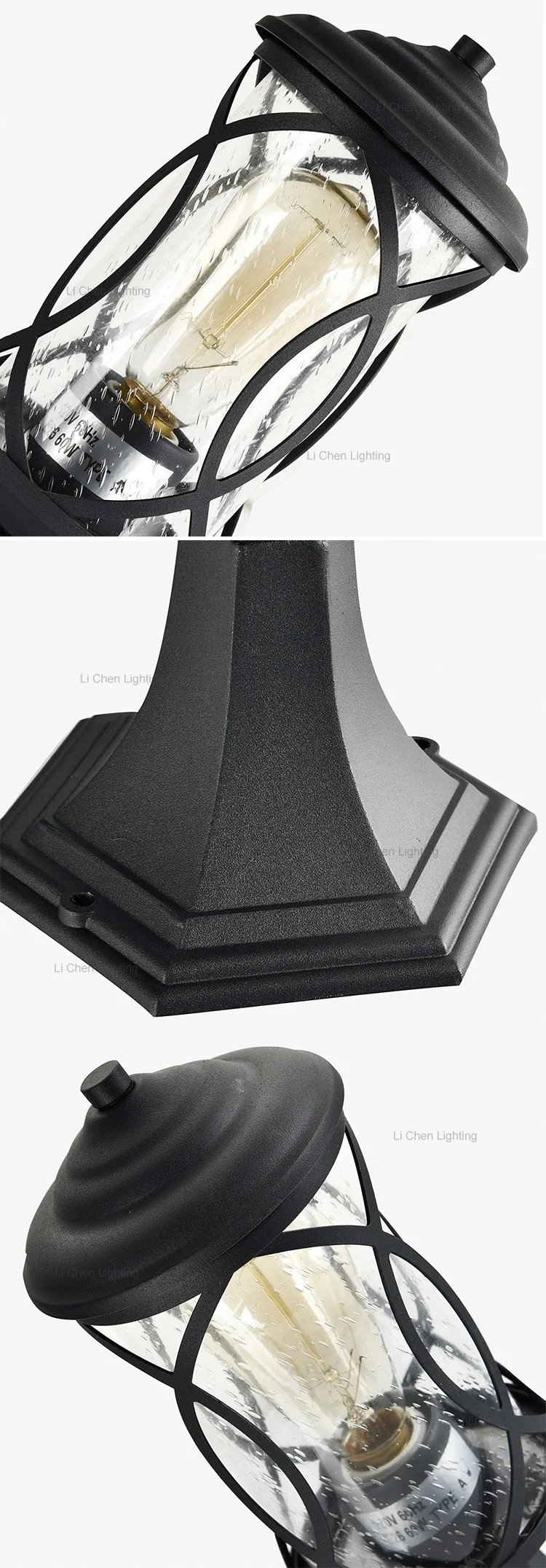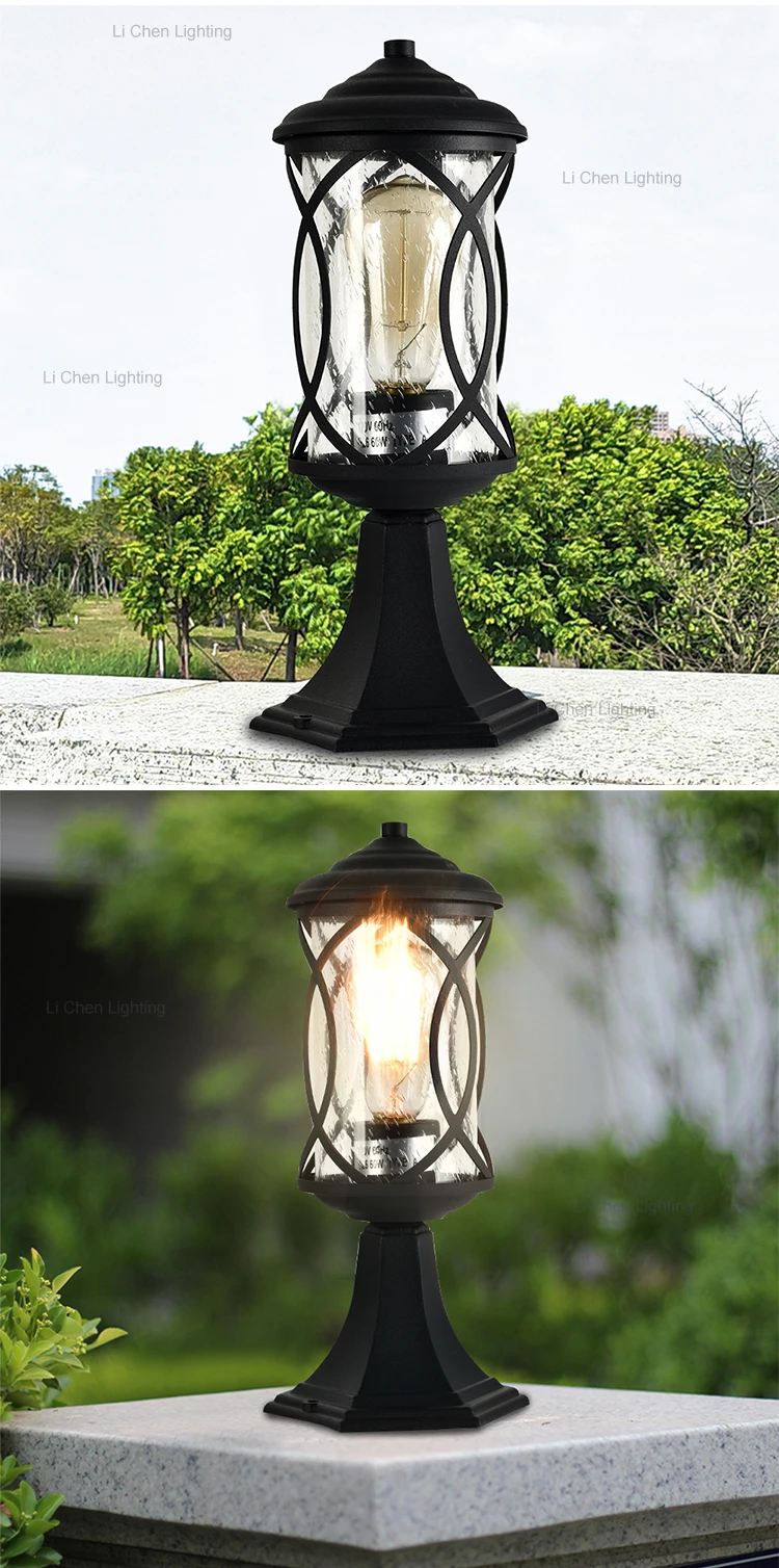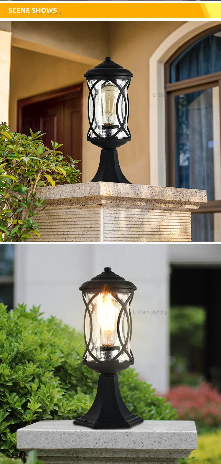 정교한 빛 확산을 위한 줄무늬 유리 쉐이드와 기하학적 금속 프레임 에너지 효율적인 LED 필라멘트 전구 (16W-66W 적응 가능, 표시된 대로) 광범위한 전압 호환성 (110V-220V, 0.5A) IP65 등급의 방수 및 방진 구조 잔디, 차도, 마당, 입구 기둥 등에 적합