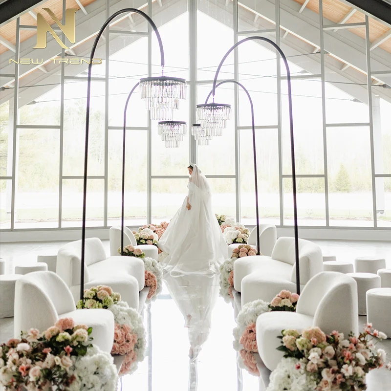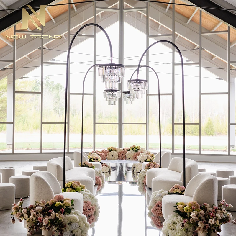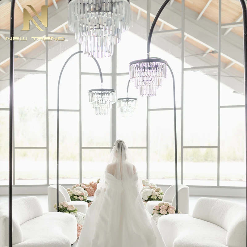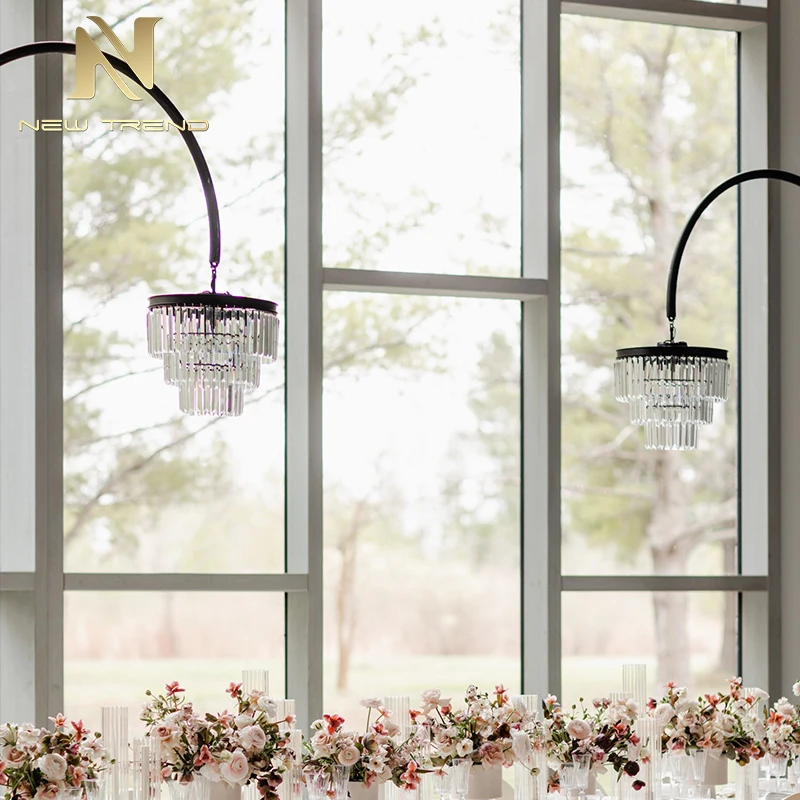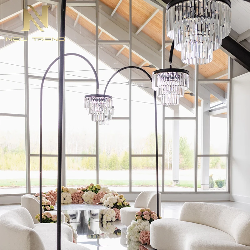 New Product Wedding Decoration Acrylic Crystal Road Lighting Chandelier Stand for Wedding Props Floor LampThis elegant wedding road lighting chandelier stand features a tall, sleek black metal frame gracefully curved to support a multi-tiered acryl...