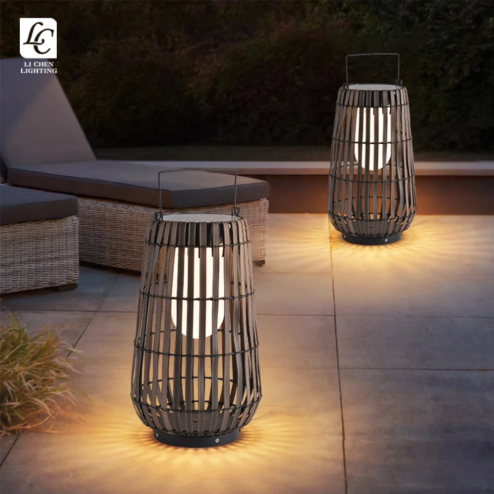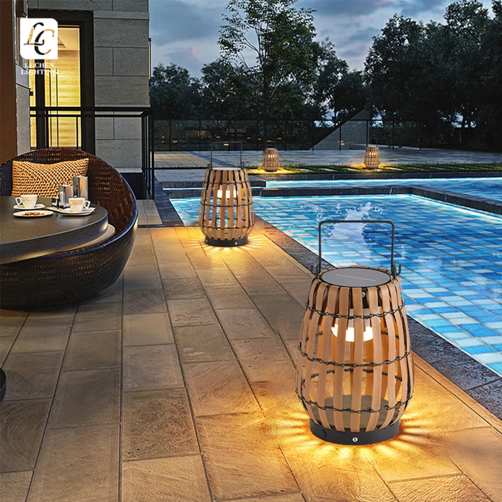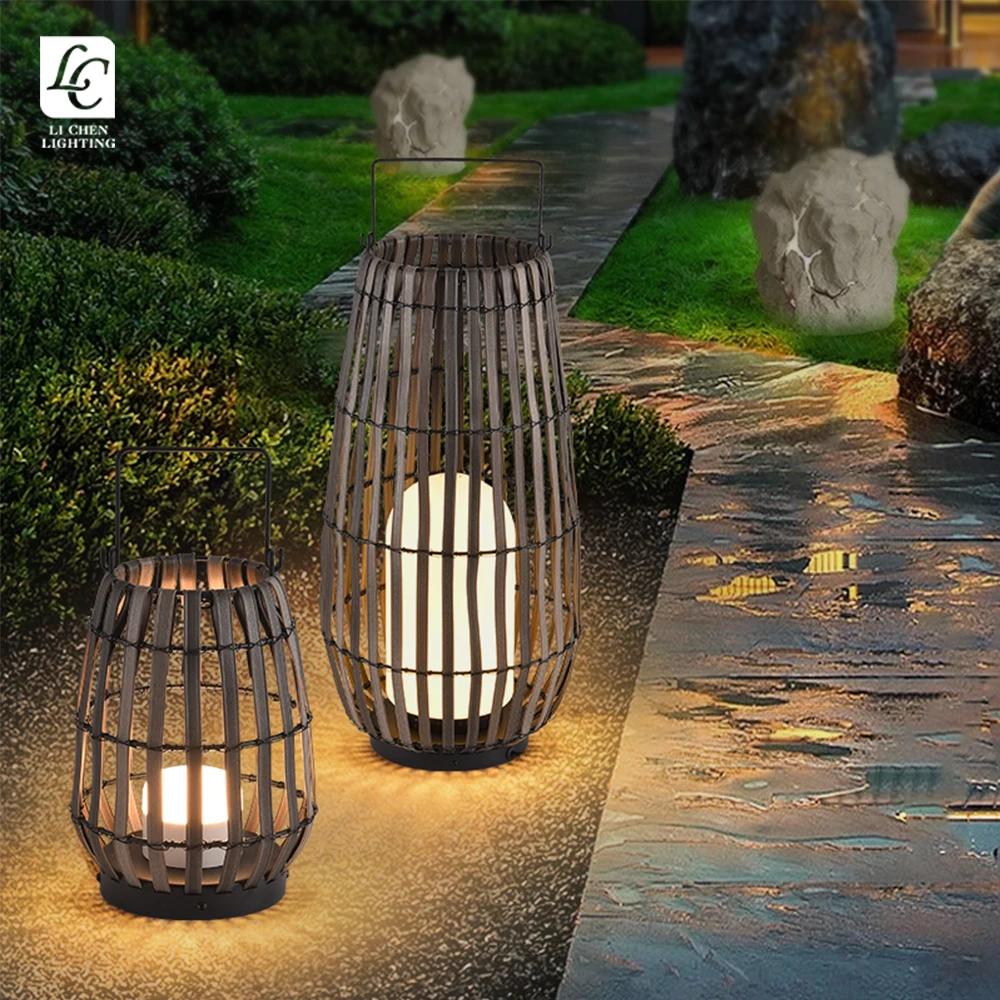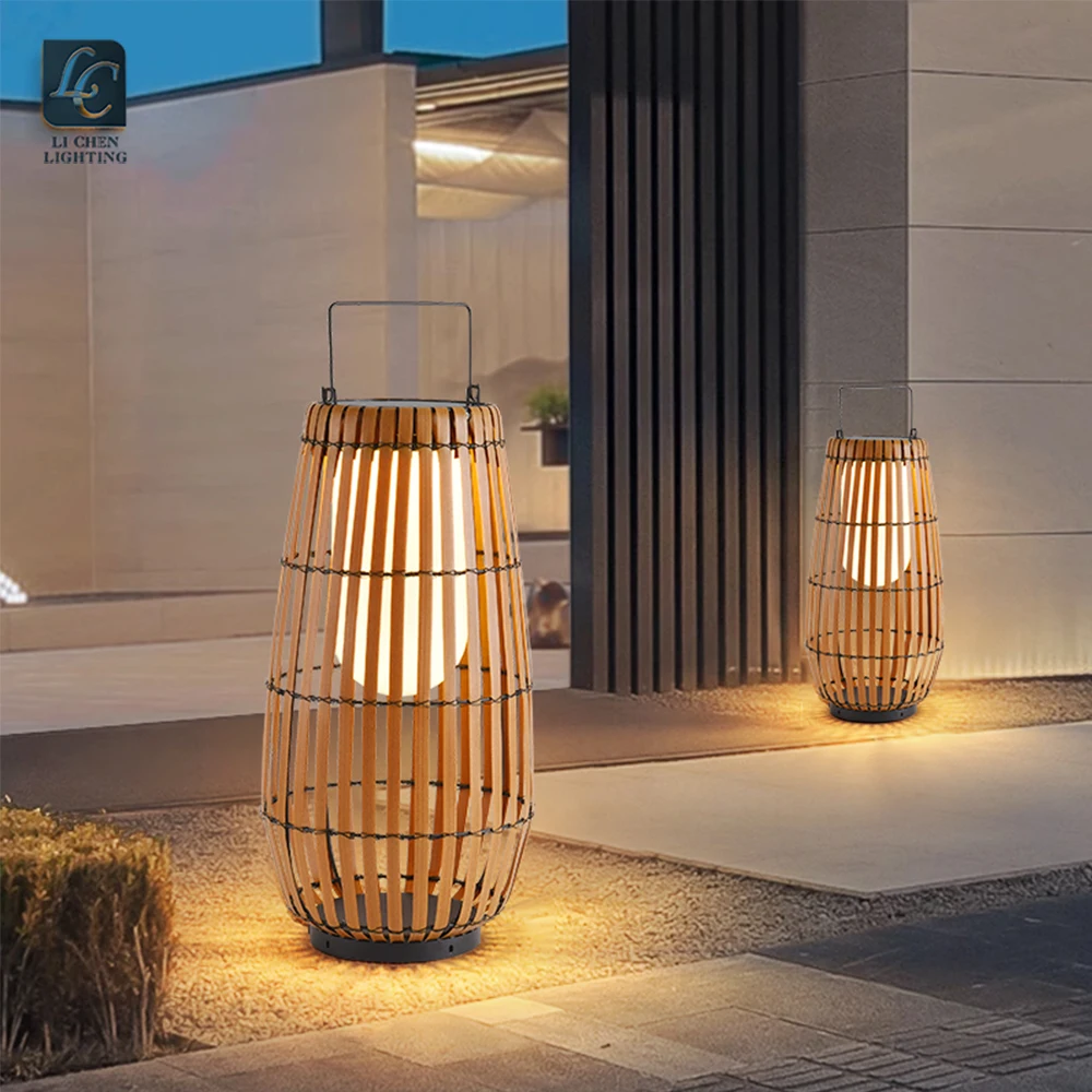 Duurzaam bamboe-weefwerk met robuuste metalen basis Op zonne-energie met automatische schemer-schakelaar Warmwitte LED voor een uitnodigende buitensfeer Draagbaar ontwerp met stabiele grondspiesbevestiging