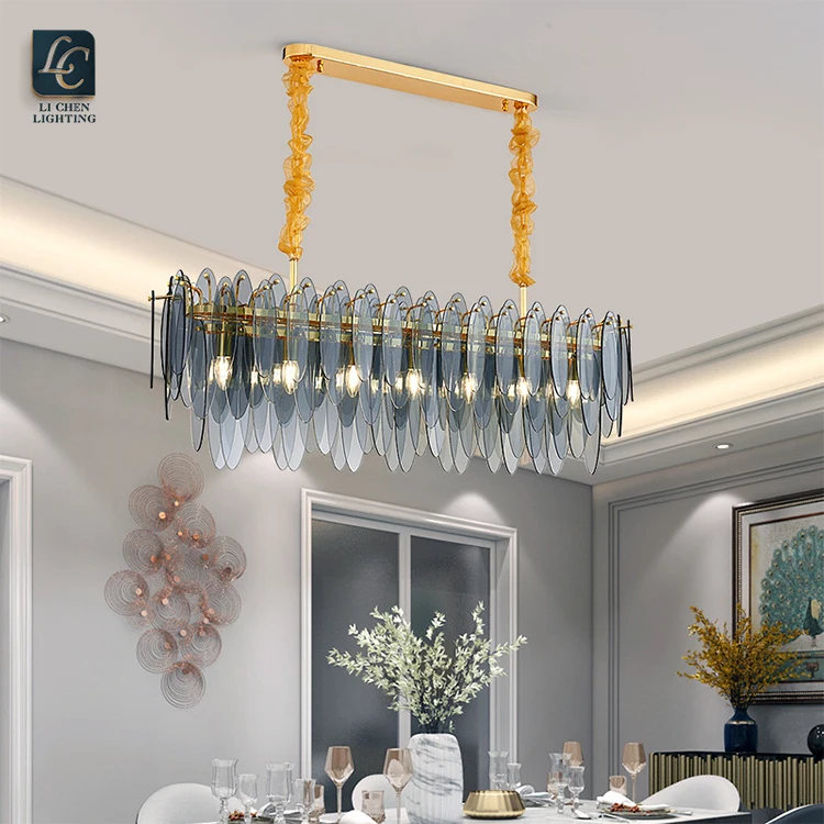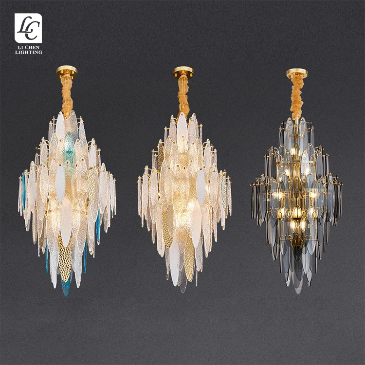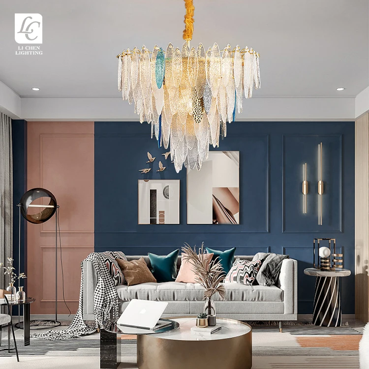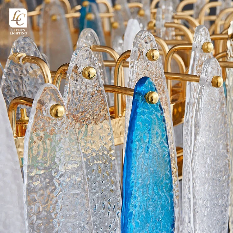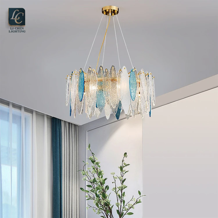 Luxury Design Residential Decoration Dining Living Room Glass Chandelier LampThis exquisite glass chandelier lamp features a stunning circular design with alternating transparent and blue glass panels suspended from a sleek golden frame. The care...