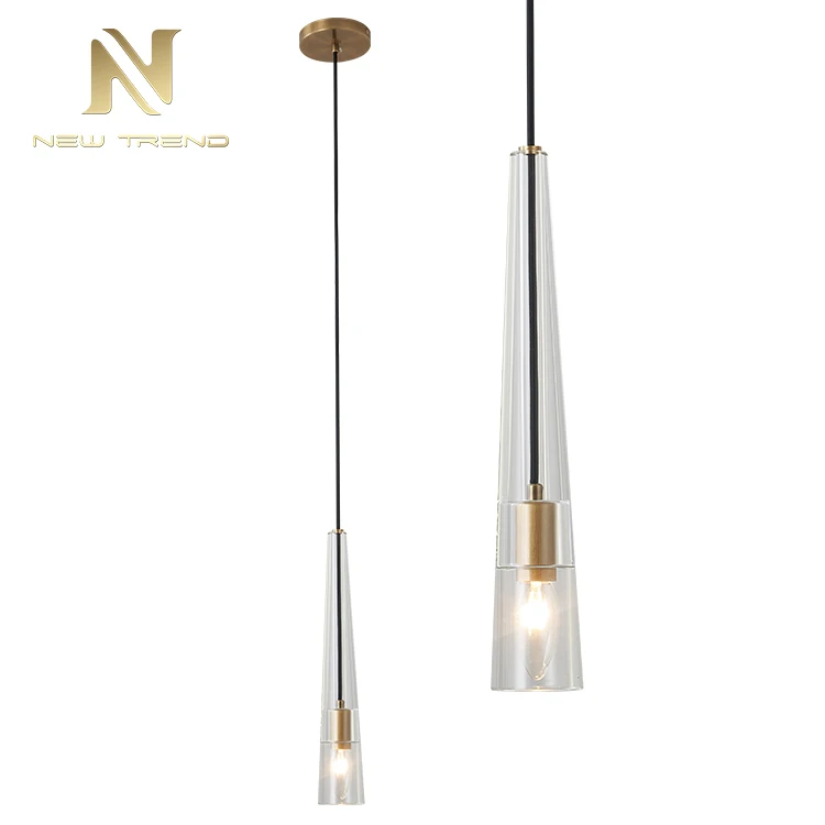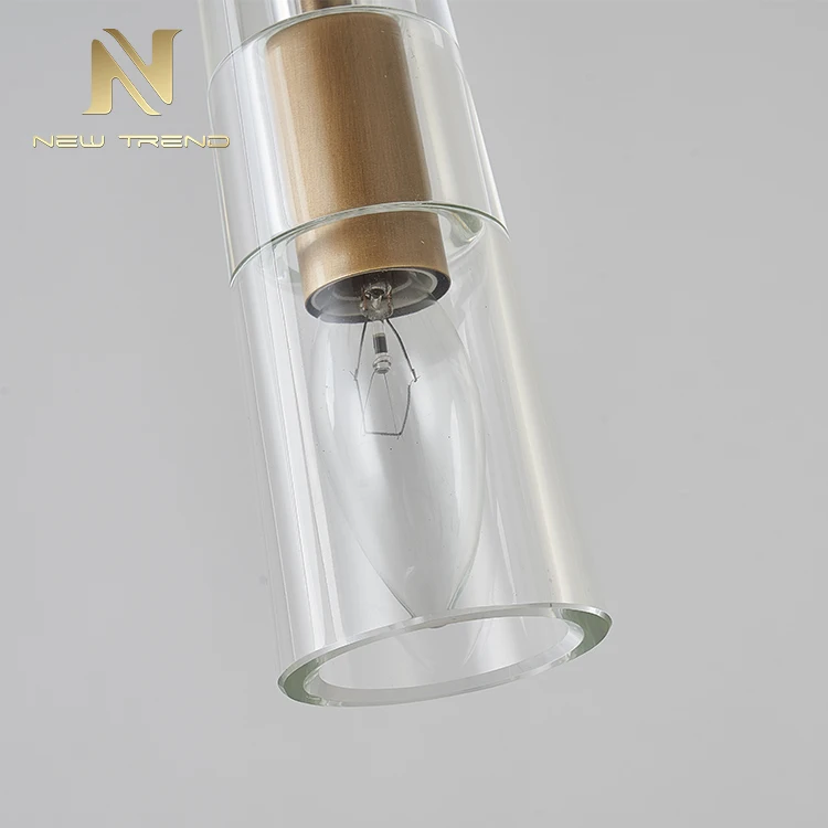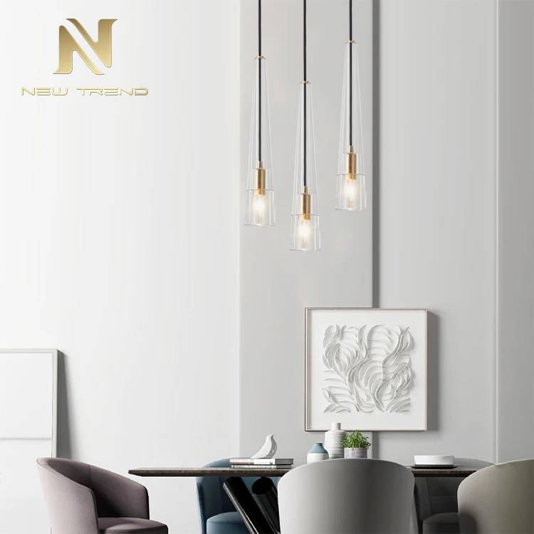 Modern Design Indoor Dining Room Living Room Decoration E12 K9 Crystal LED Chandelier LampThis modern LED chandelier features a sleek three-light design with minimalist gold-finish bases and transparent cylindrical K9 crystal glass shades, suspende...