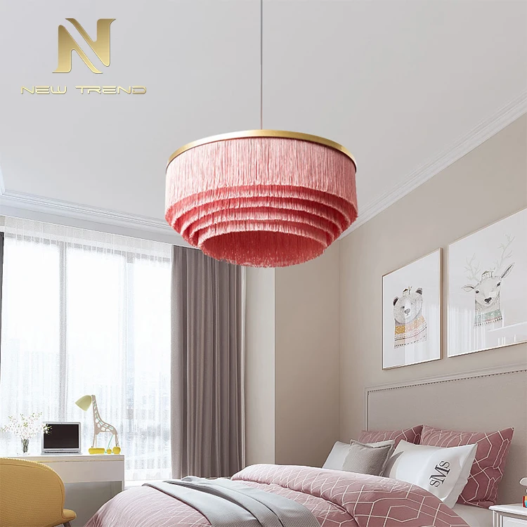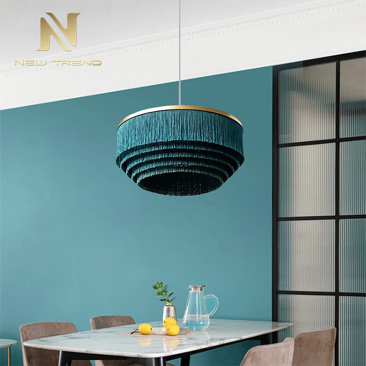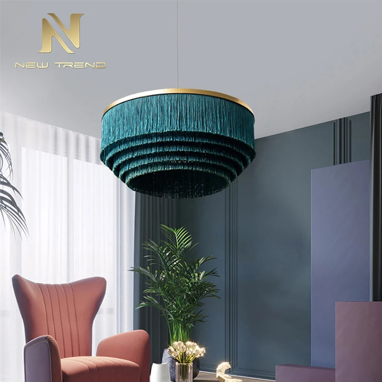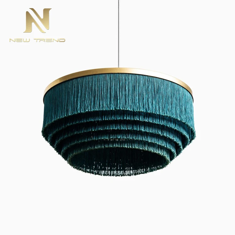 Modern Design Indoor Decoration Hanging Lighting Tassel LED Chandelier Pendant LightThis exquisite modern chandelier redefines elegance with its innovative tassel-inspired design, featuring meticulously arranged teal (peacock green) fiber strands suspended in concentric layers to form a soft, flowing silhouette. The strands cascade from a sleek circular metal hoop in a warm brass or bronze finish, creating a striking contrast between the delicate tassels and the sturdy frame. When illuminated by integrated energy-efficient LED lighting, the fixture emits a gentle, diffused glow through the textured fibers, casting a tranquil and sophisticated ambiance. Ideal for enhancing living rooms, dining areas, bedrooms, or boutique hotels, this pendant light blends organic texture with contemporary aesthetics, serving as both a functional light source and an artistic statement piece.Crafted for versatility, the chandelier’s lightweight yet durable construction ensures easy installation and longevity. The pure white background emphasizes its vibrant color and elegant form, allowing it to adapt to minimalist, modern, or bohemian interior styles. Customizable in size, tassel density, and color options, this fixture offers flexibility for personalized decorative needs while maintaining its eye-catching appeal.Tassel LED Chandelier, Modern Hanging Pendant Light, Teal Fiber Chandelier, Indoor Decoration Lighting, Bohemian Style Chandelier, Brass Ring Pendant Lamp, Soft Diffused Light Fixture, Custom Tassel Chandelier, Artistic Ceiling Light, Minimalist Tassel Pendant.