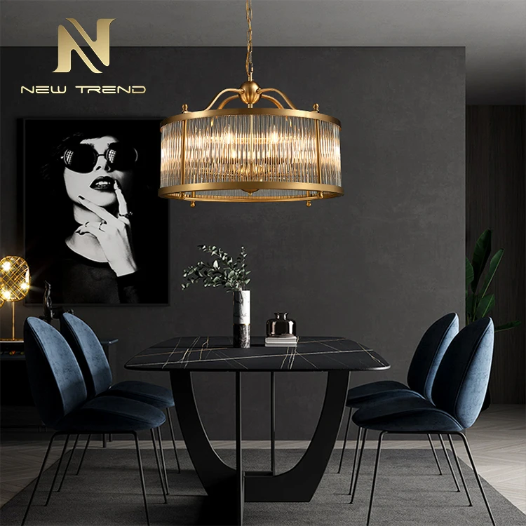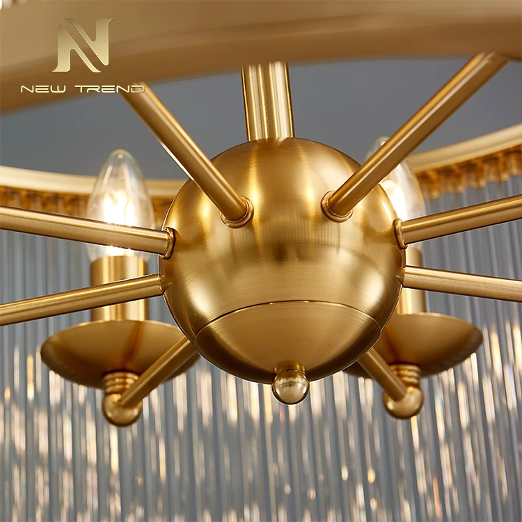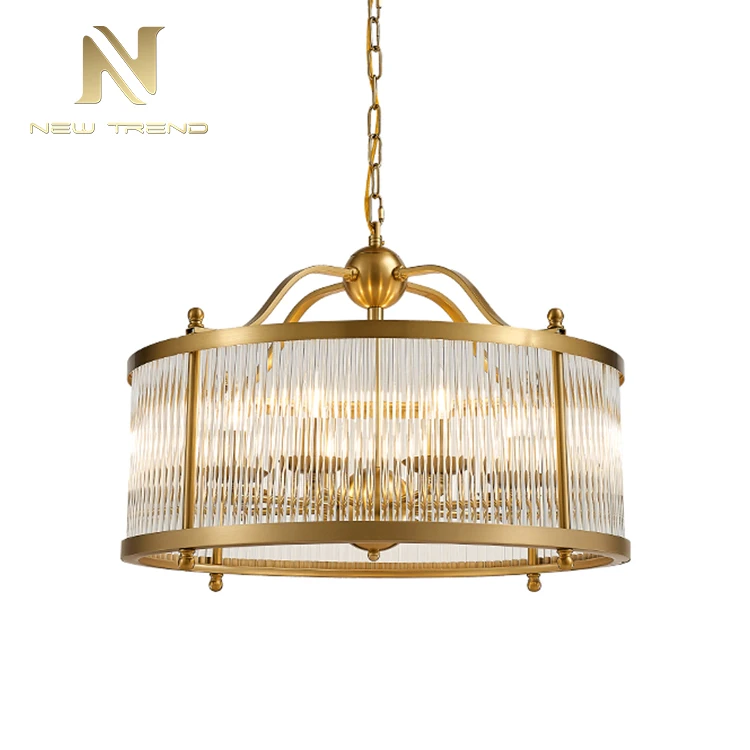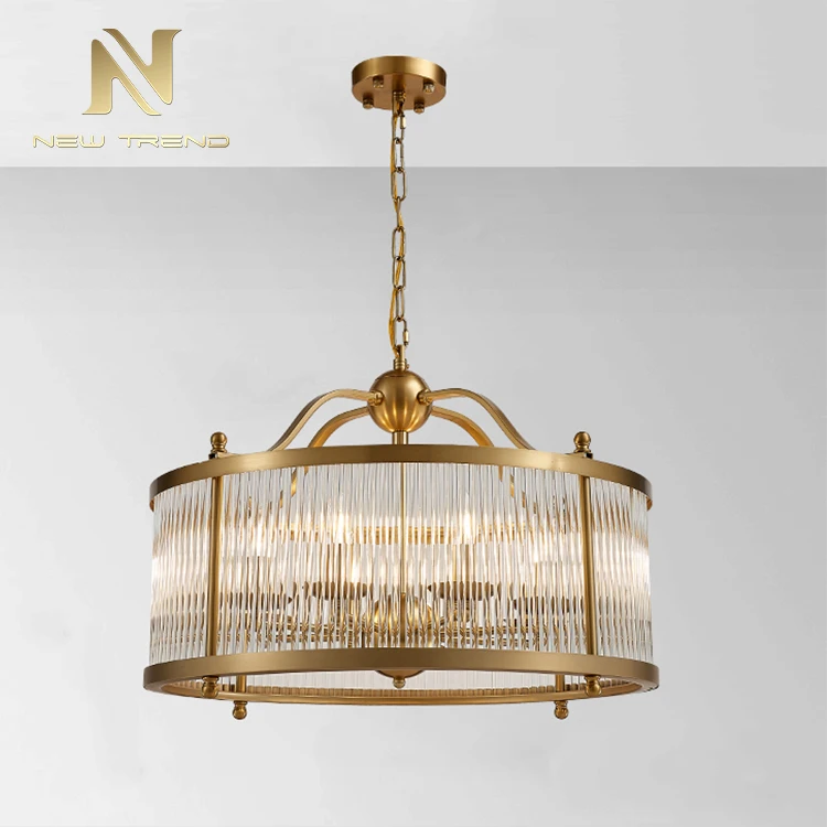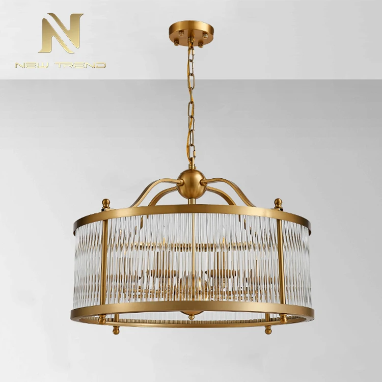 New Product Vintage Style Dinning Room Decoration Copper Frame Led ChandelierThis elegant vintage-style chandelier combines classic design with modern functionality, featuring a cylindrical copper-finished frame adorned with vertically ribbed glass ...