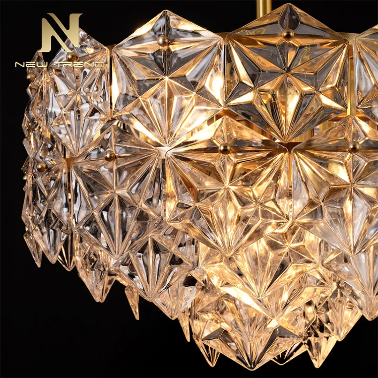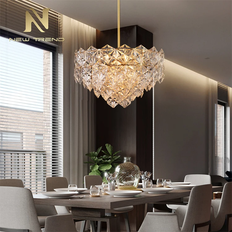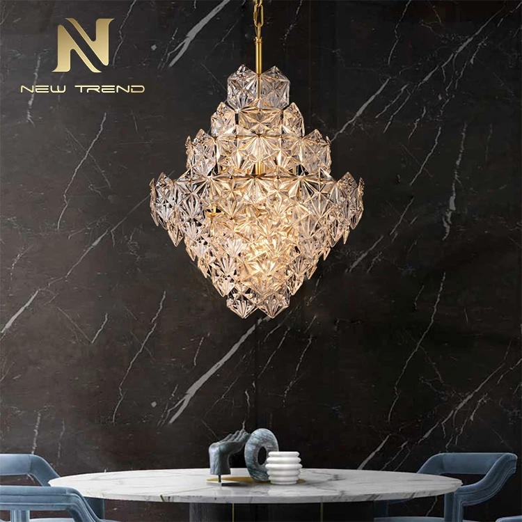 Hot Sale Villa Home Decoration Glass Chandeliers Modern Chrome LED Pendant LightThis stunning modern glass chandelier showcases an architectural design composed of numerous geometrically cut crystal glass panels, meticulously arranged to form a mu...