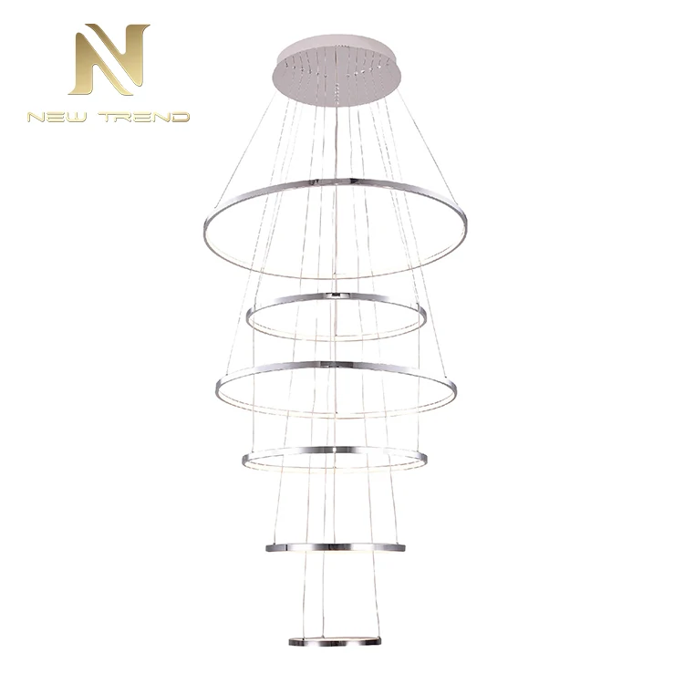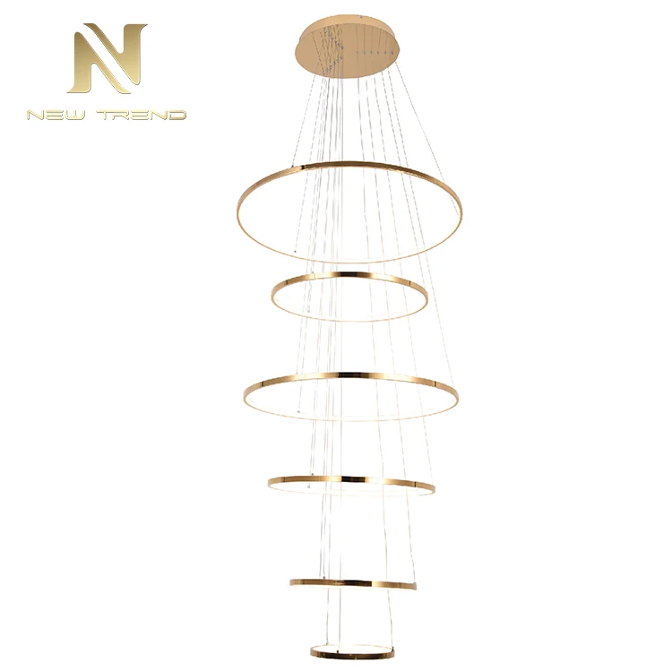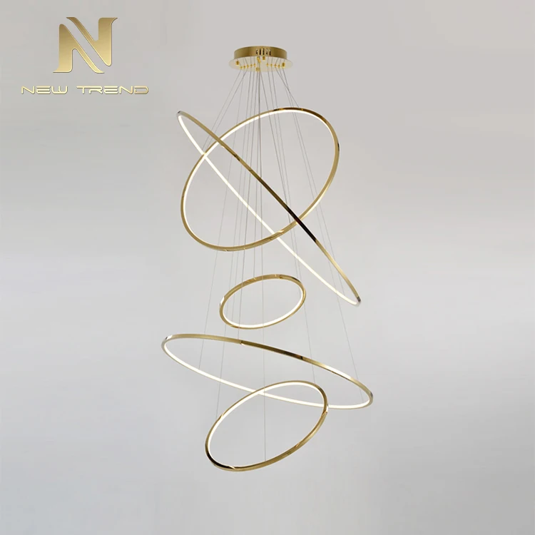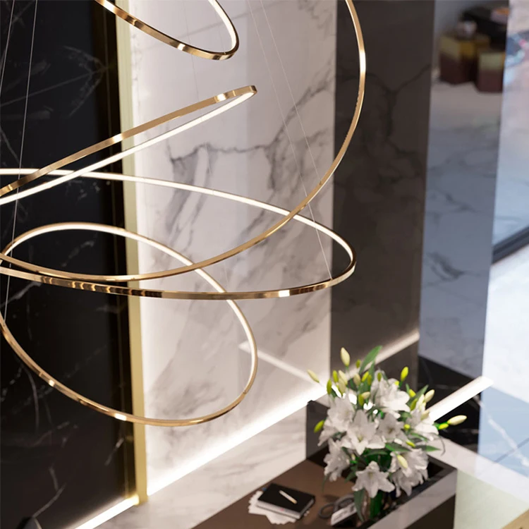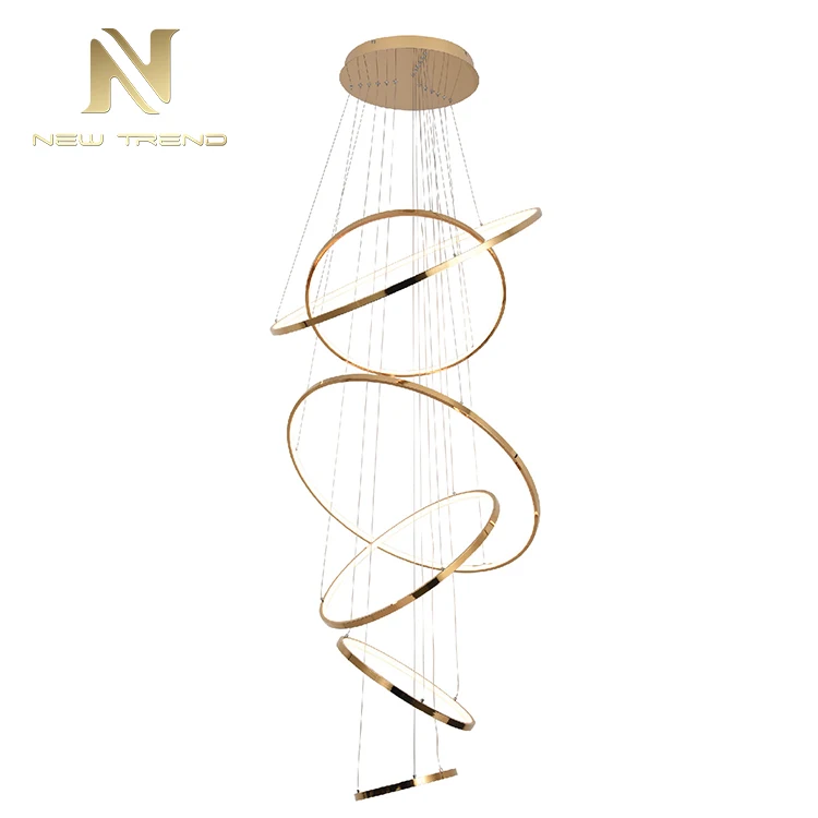 Unique Design Stainless Steel Round Modern LED Chandelier for Hotel & Villa Indoor Decoration LightingThis uniquely designed modern LED chandelier showcases an artistic arrangement of interlocking golden stainless steel rings, meticulously laye...