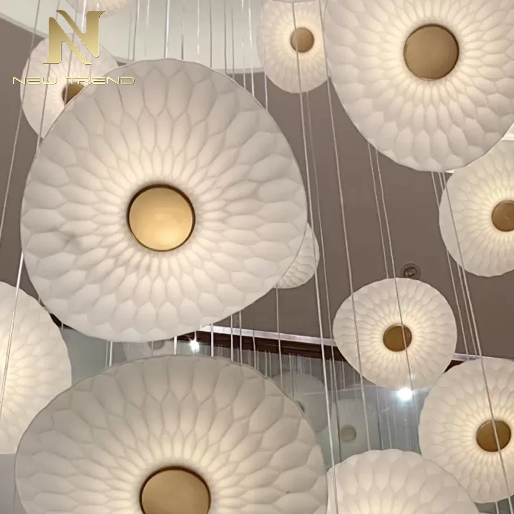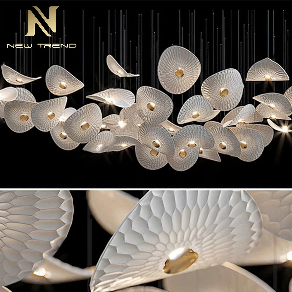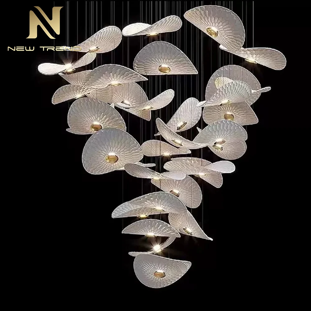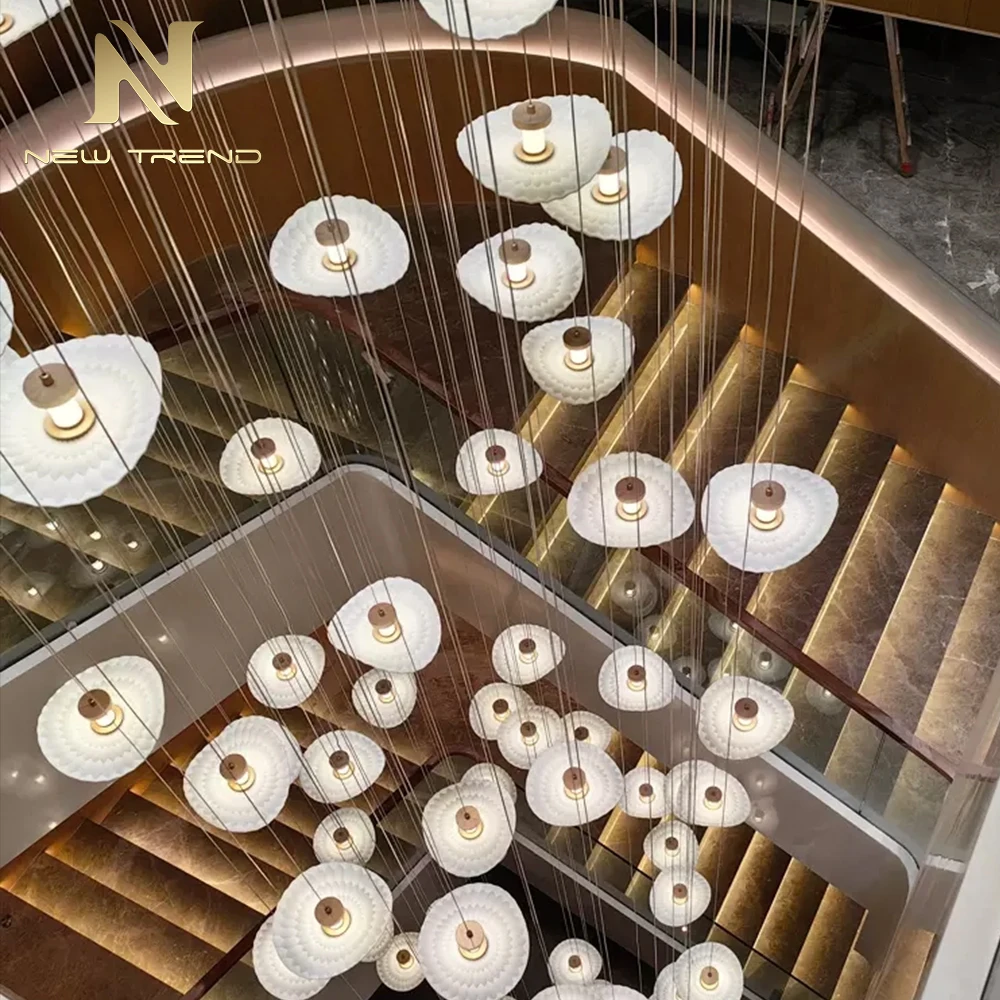 villanın Holü, Otel Giriş Holü ve Merdiven İçin Modern İç Dekorasyon Özgün Lamba – LED Avize Sarkıt Aydınlatması Bu özel tasarlanmış modern LED avize, hafif eğimli, düzensiz şekilli yarı saydam beyaz polimerden yapılan yaprak benzeri abajurların organik kümesiyle lüks aydınlatmayı yeniden tanımlıyor. Her abajur yumuşak radyal bir doku sunar ve ince siyah metal kablolarla değişen yüksekliklere asılır, dinamik ve akıcı bir kompozisyon oluşturur. Her 'yaprak' merkezinde, sıcak altın rengi bir LED, hem ortam ışığı sağlarken hem de sanatsal bir zarafet sunan yumuşak, davetkar bir ışık yayar. Villa salonları, otel lobileri veya merdiven sahanlıkları gibi büyük mekanlar için ideal olan bu asma lamba, çağdaş tasarımı doğal ilhamla birleştirerek iç mekânların modern estetiğini skulptörel zarafetiyle güçlendiren çarpıcı bir odak noktası görevi görür. Özelleştirmeye uygun şekilde tasarlanan avize, farklı tavan yüksekliklerine ve mekânsal düzenlere göre boyut, gölge yoğunluğu ve askı uzunluğu açısından özelleştirilebilir. Derin siyah arka plan, temiz ve ışıl ışıl formunu vurgulayarak avizenin minimal, İskandinav veya üst düzey ticari mekânlarda dikkat çekmesini sağlar. Enerji verimli ve kurulumu kolay olan bu ürün, estetik yeniliği pratik işlevle birleştirir. Özel LED Avize, Modern Sarkan Aydınlatma, Köşk Holü Otel Lobisi Aydınlatması, Yaprak Şeklindeki Abajurlu Avize, Organik Kümeli Sarkan Lamba, Özel İç Mekân Dekorasyonu, Merdiven Dairesi Avize Tasarımı, Işıklı Polimer Aydınlatma, Çağdaş Asılı Armatür, Lüks Dekoratif Aydınlatma