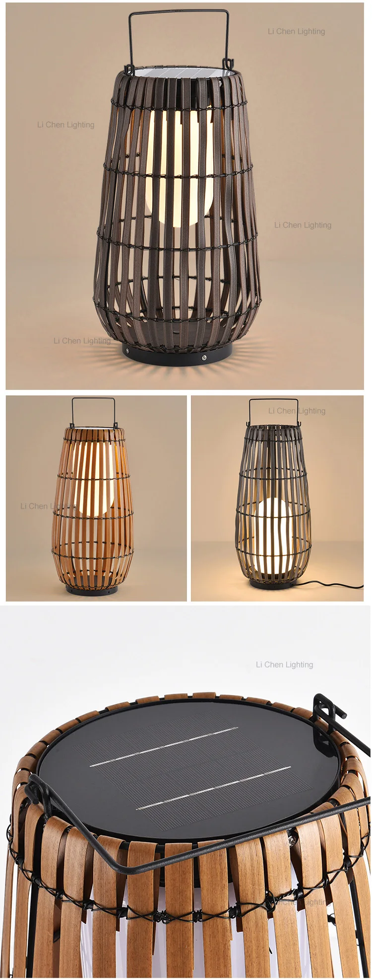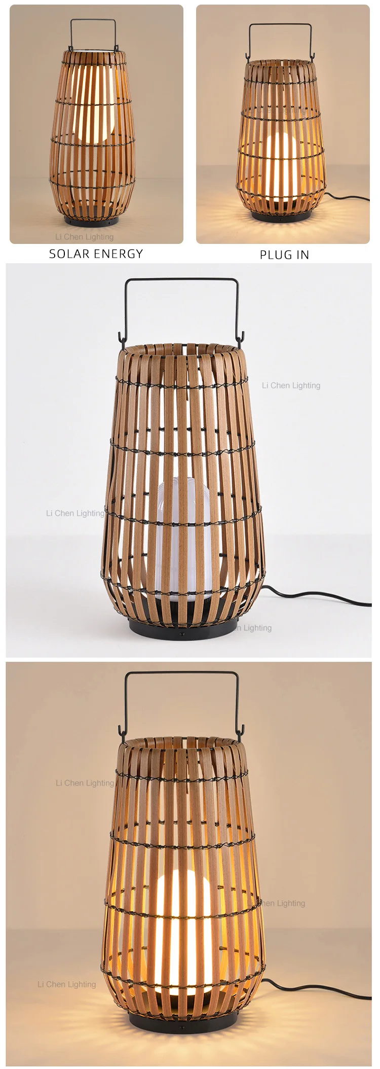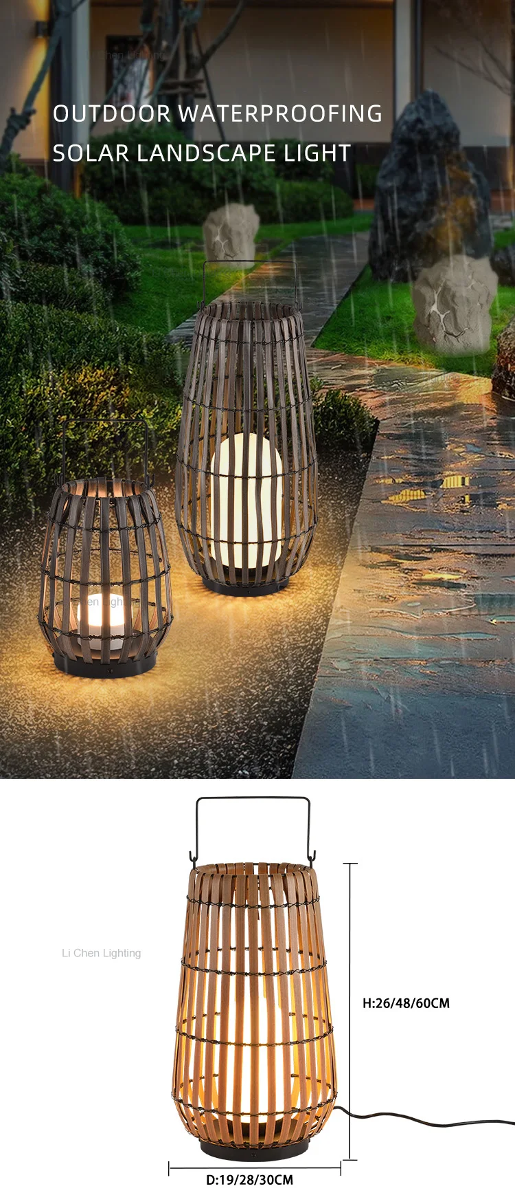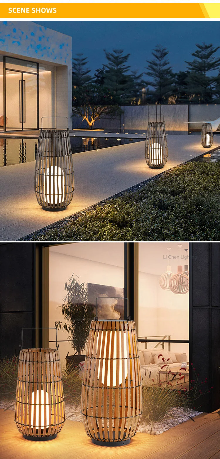 Duradgorlik uchun mustahkam metall asosga ega barqaror bambuk to'qish Tushdan tonggacha avtomatik his etuvchan quyosh batareyasi bilan ishlaydi Xavfsiz tashqi muhit uchun issiq oq LED Barqaror yer tagiga o'rnatiladigan tiqiluvchi konussimon dizaynga ega hamyonbop model